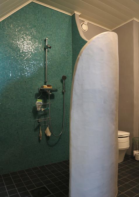 I stengolven, badrummen och hallen finns golvvärme. Bakom kakelugnsväggen döljer sig en 500-liters vattentank som vintertid värms upp med ved. När det är för varmt för