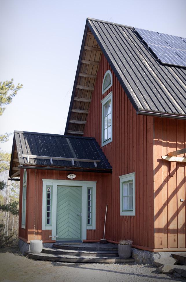 Husets fasad är riktad rakt mot söder och solpanelerna är placerade i optimal vinkel på det tjärade trätaket. På gården finns även lagerbyggnader och en gårdsbastu.