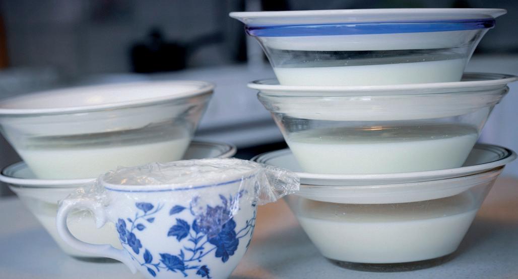 – Man tar lämpliga assietter och bygger upp en trave med byttor, med en assiett emellan. Försiktigt – kanske tre och tre så att traven inte stjälper! Litet plastfolie sätts på undermjölkskoppen. Har jag lagt upp filen på kvällen, så måste den stå rumsvarmt cirka ett dygn, eller tills det bildats ett gräddlager på ytan och filen känns fast. Slutligen ordnar jag plats i kylen och ställer in byttorna där. Senast följande morgon är filen klar.