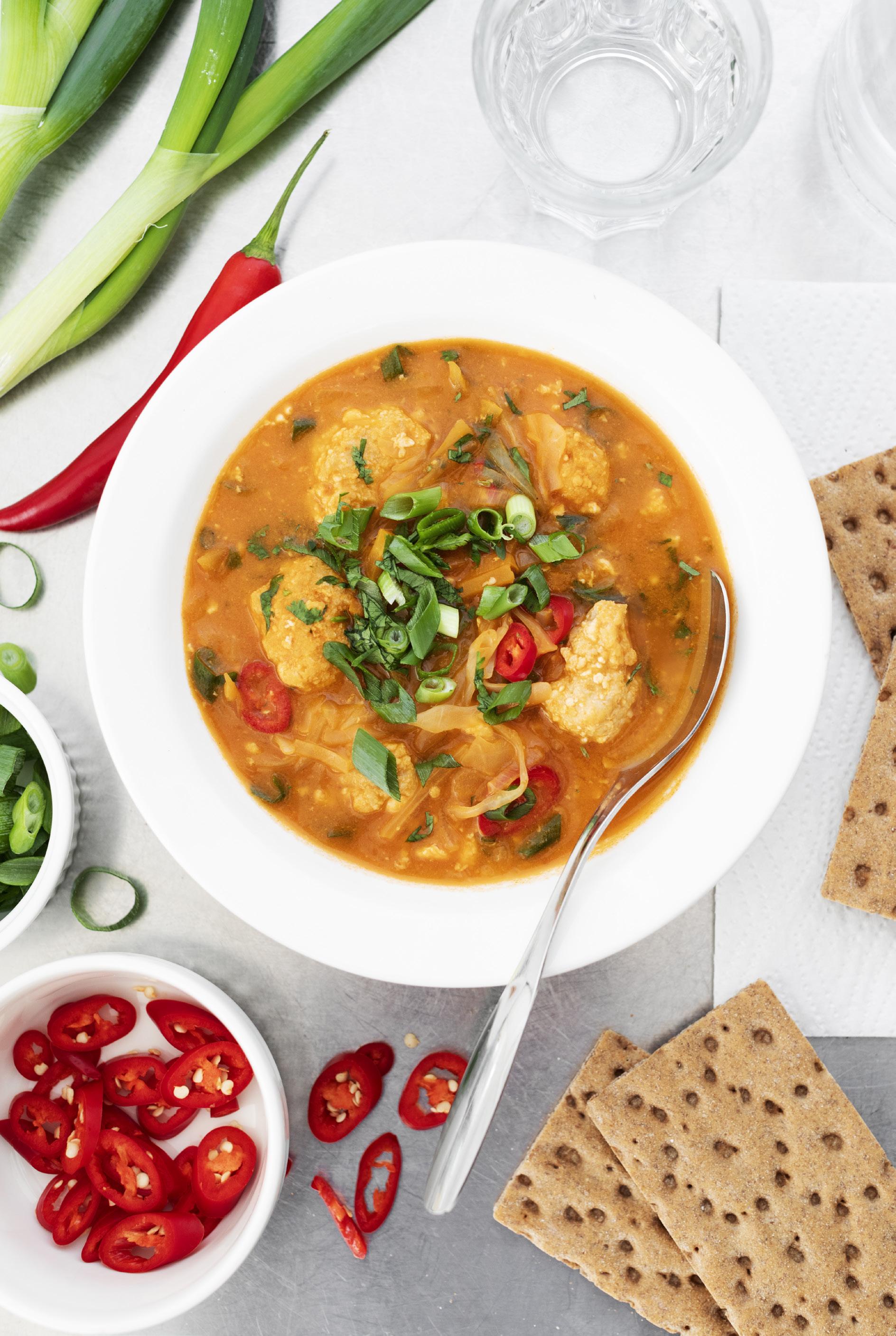 En mustig, exotisk soppa där fiskfärsen på id, braxen, gädda eller en blandning av dessa blir ett bra tillskott med protein och näring i den goda soppbasen. En egen räkbuljong gör man lätt genom att bryna 500 g till 1 kg räkskal, med lite tomatpuré, hälla på vittvin eller äppelmust, koka sakta i 20 minuter och sila – redan en liten mängd ger mycket smak i soppan.