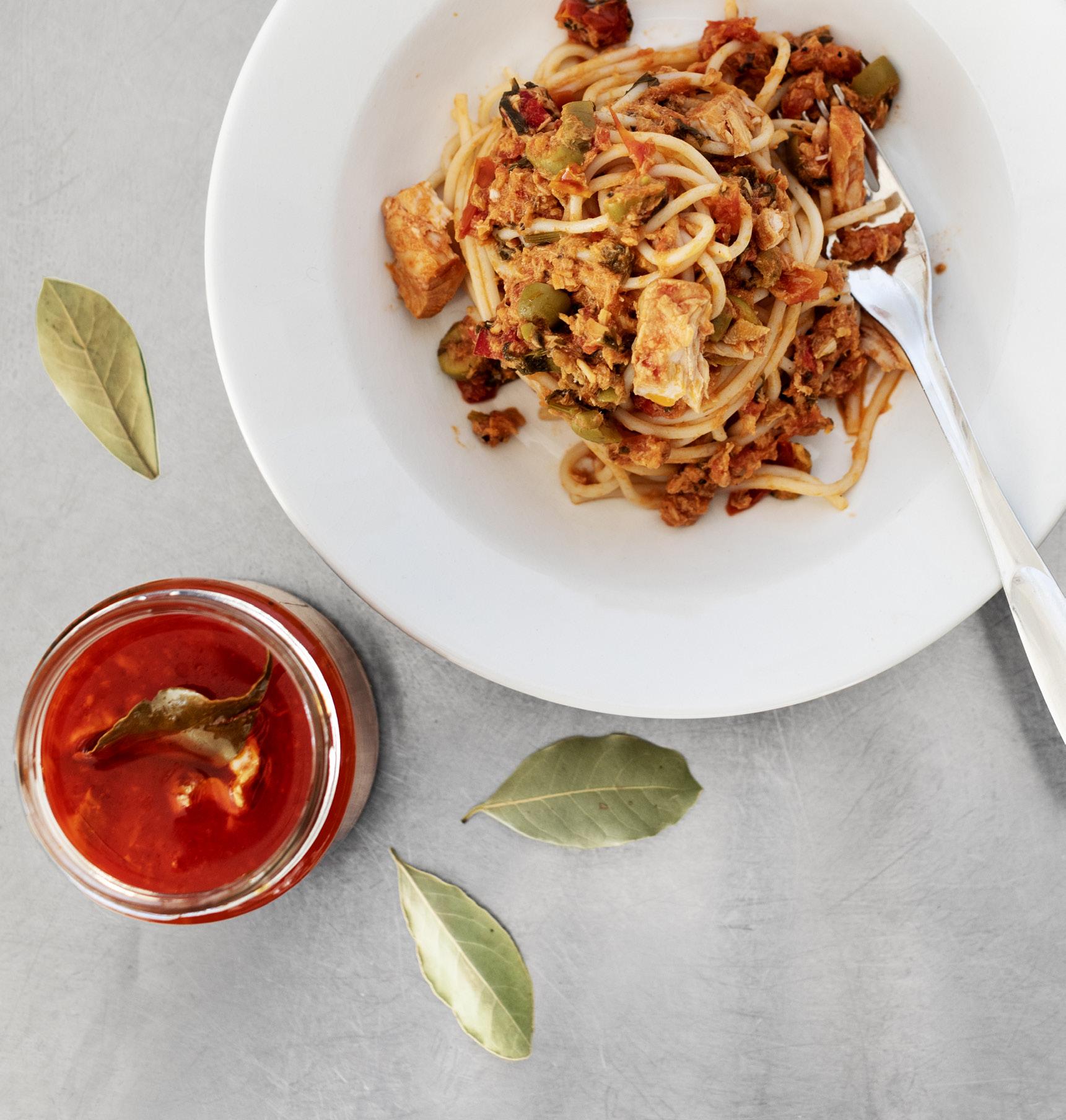 En italiensk pastarätt som här får karaktär av egen fiskkonserv som inte alls är svår eller dyr att göra i eget kök, stort som litet. Underutnyttjade fiskarter som id, braxen och mört passar mycket bra att lägga på burk. Dessa fiskarter innehåller mycket ben som helt mjuknar och ”försvinner” i konserven.