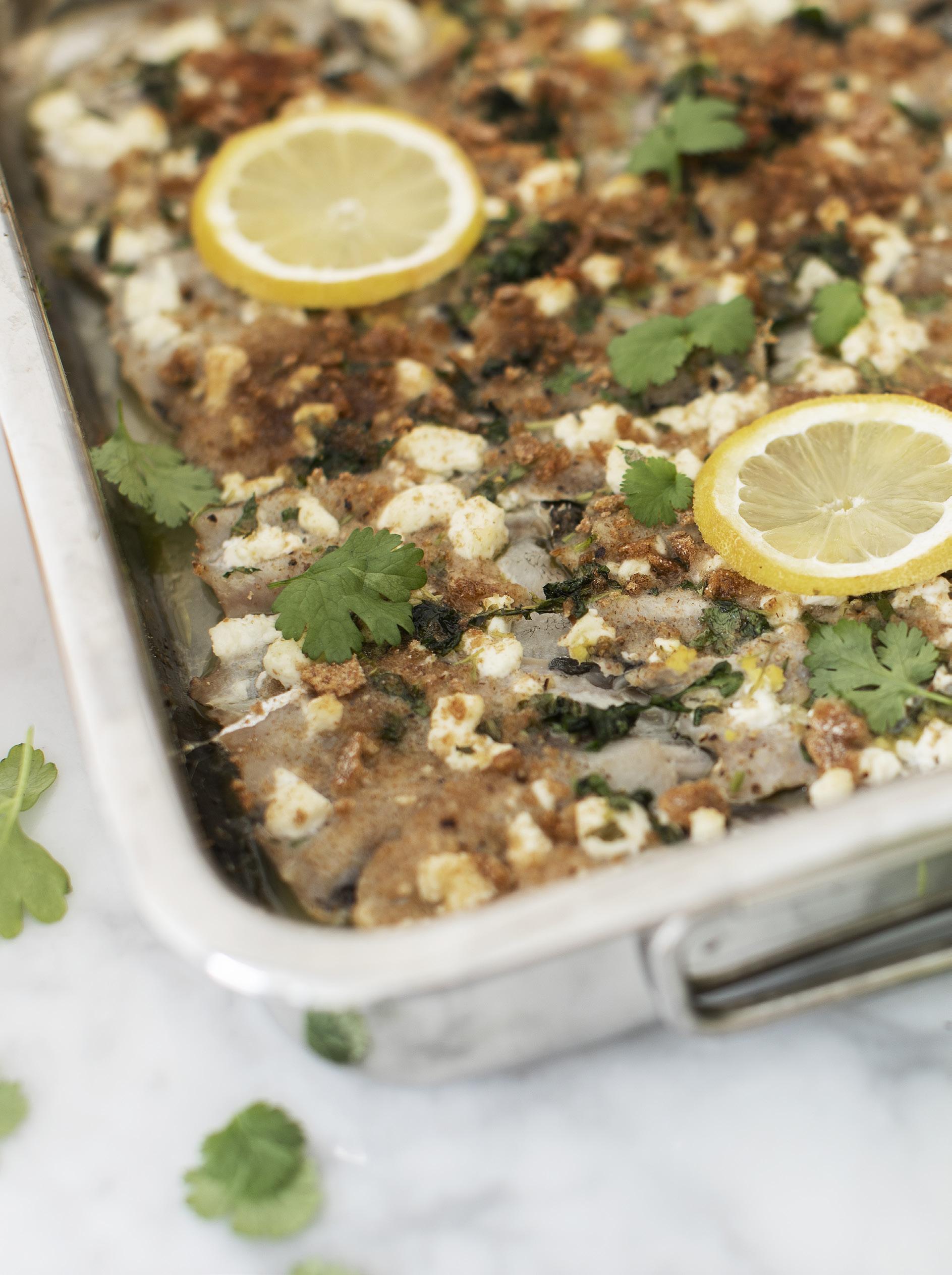 Toppa fisken med smulad fetaost, olivolja, några klickar smör, surskorpor och persilja (spara en del till garnering). Placera några skivor citron på fisken.