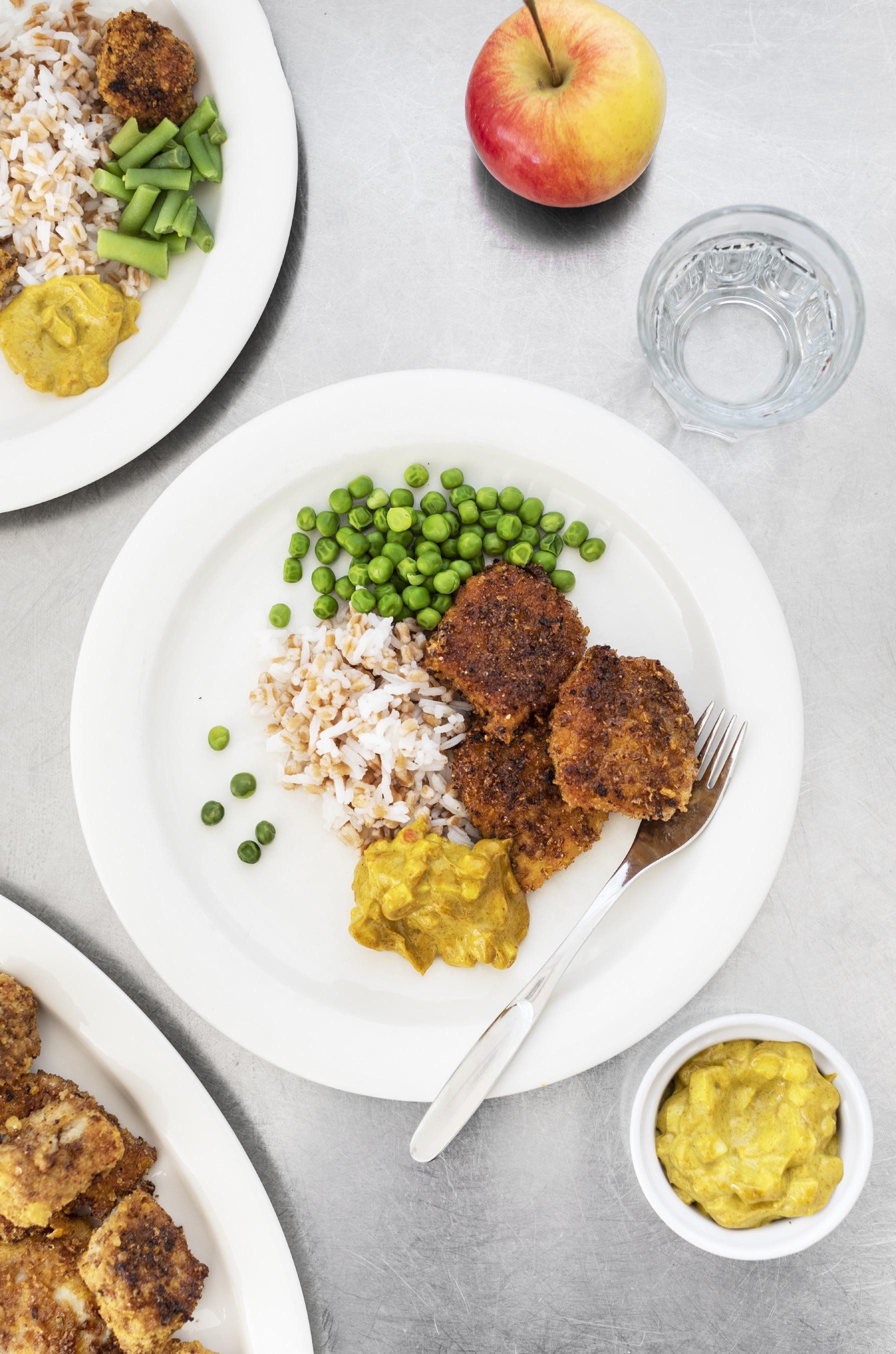 Skär äpplena i små tärningar. Blanda ihop äpple, majonnäs, curry och salt. Servera till fisknuggets tillsammans med ris. Vitt ris blandas och serveras med inhemskt korn eller speltgryn.