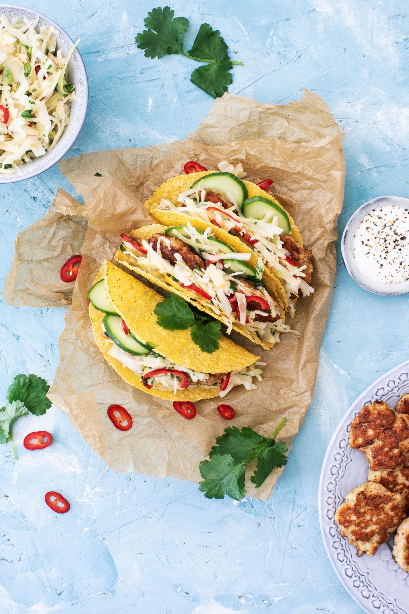 Tacoskal eller tortillabröd Fiskbiffar Kålsallad