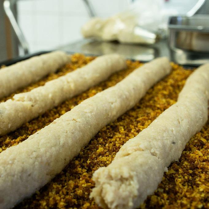 Mixa den rostade löken så att den blir finfördelad, gör detta snabbt i en mixer. Blanda lök och pankomjöl. Strö ut det på bleck. Spritsa ut en tjock korv, dela den i ca 4 cm bitar som plattas till och vänds i lök- mjölblandningen. Stek i matfett på stekbord eller i ugn.
