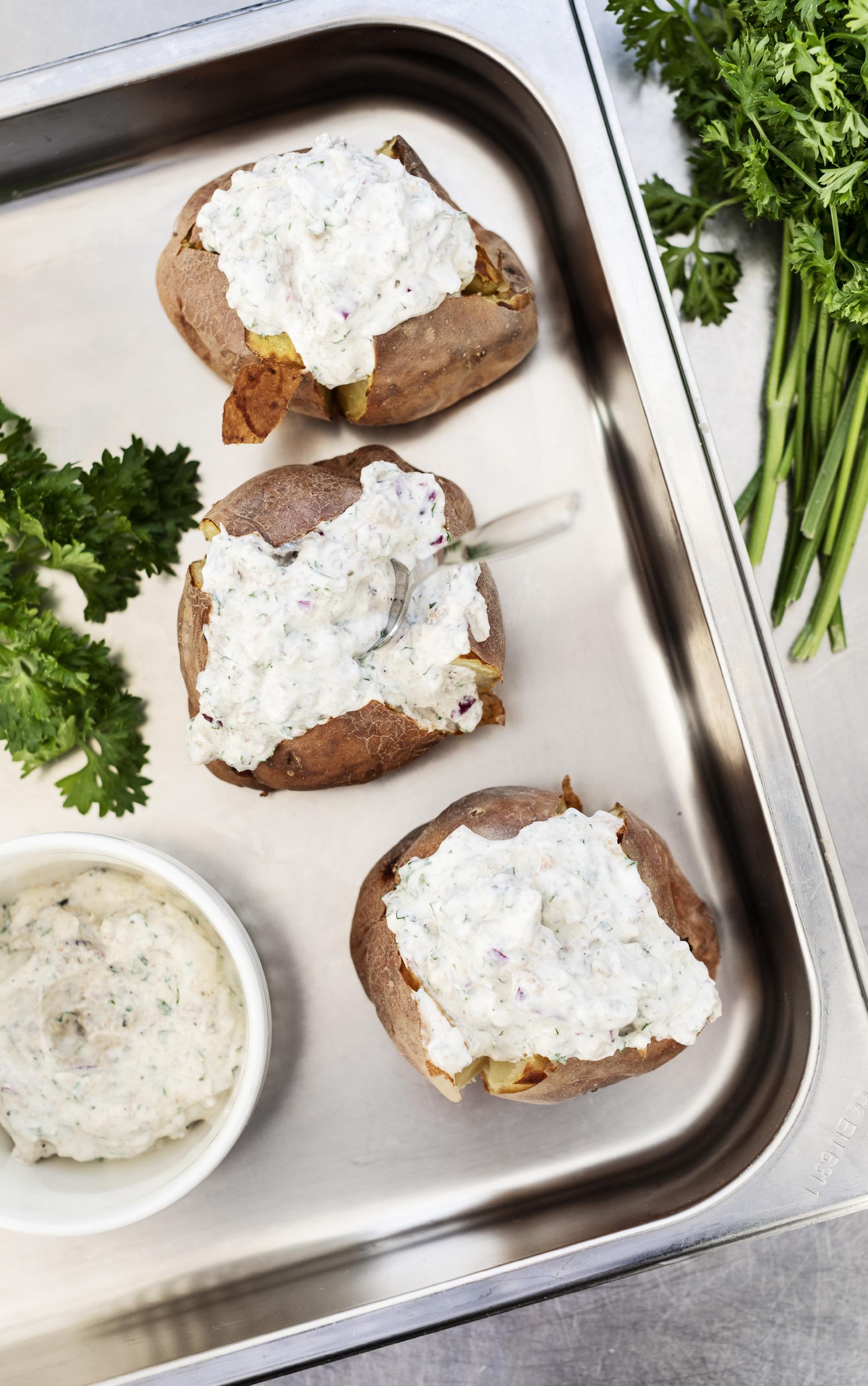 En uppskattad, enkel och god rätt att servera åt många är bakad potatis. Här görs en röra till potatisen på stekt inlagd strömming eller nors. Inläggningen har en härlig syrlighet och konsistensen ger motstånd men är ändå lättuggad för barn och unga.