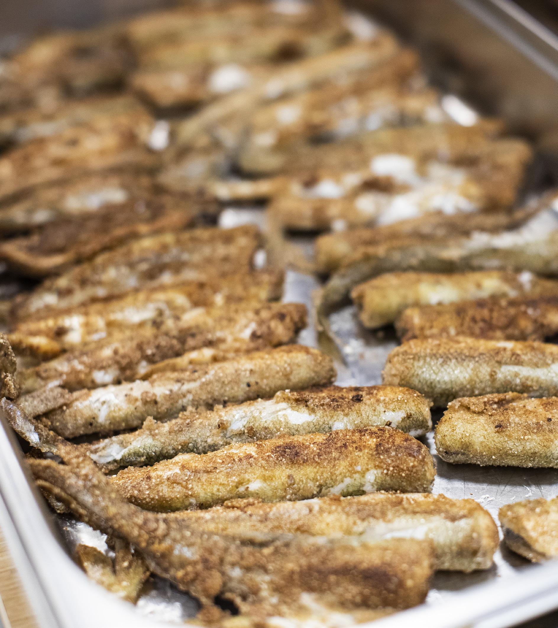Blanda mjöl, salt och vitpeppar i en skål. Lägg i fiskfiléerna, blanda om. Stek i omgångar i rikligt med matfett och eller olja. Låt svalna. Kan förstås serveras som sådan tillsammans med potatismos.