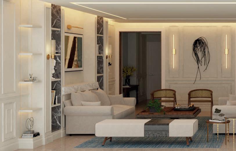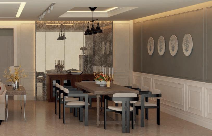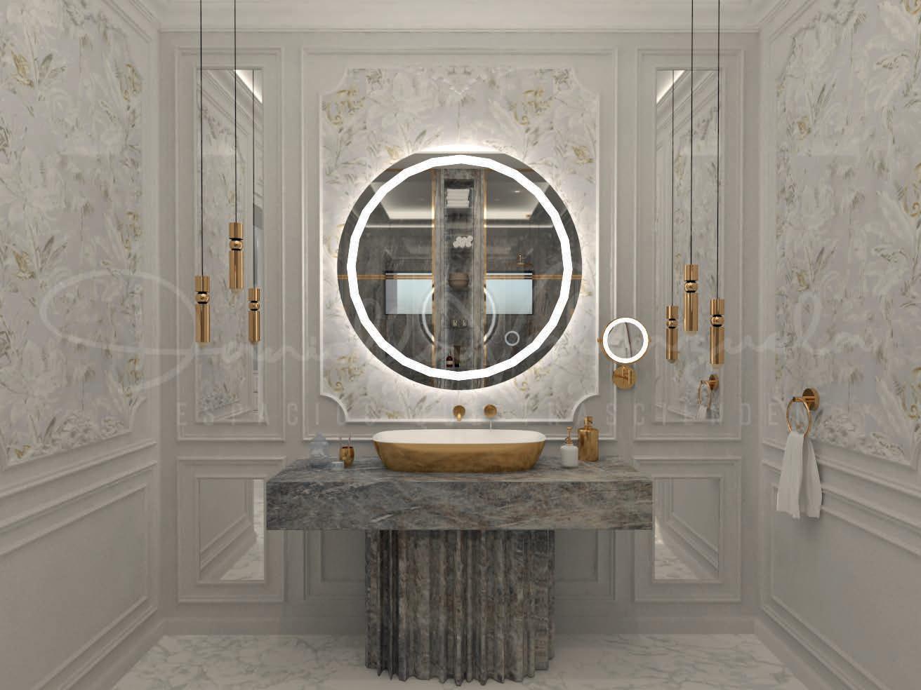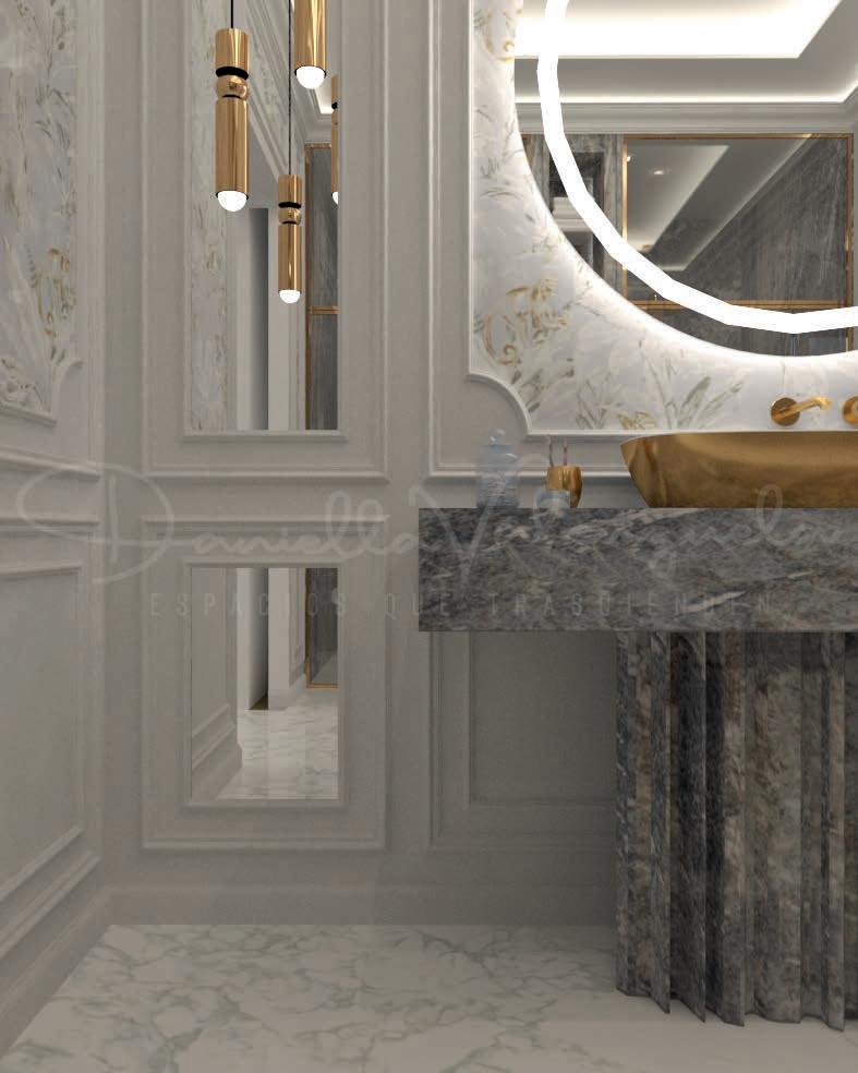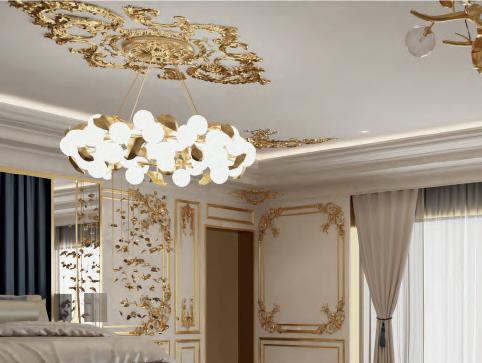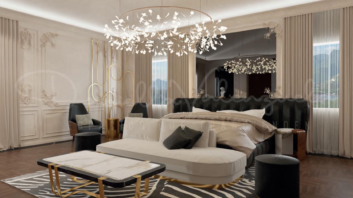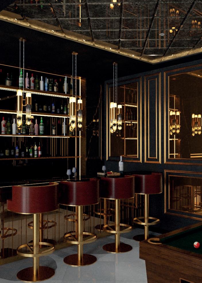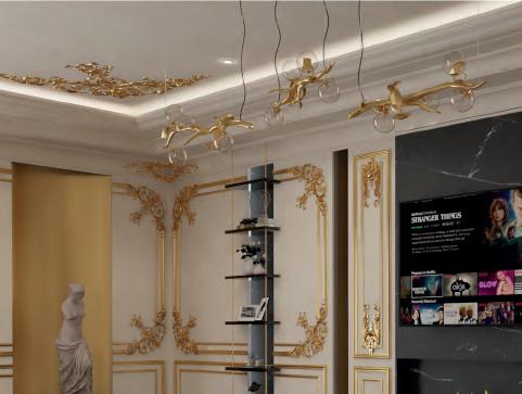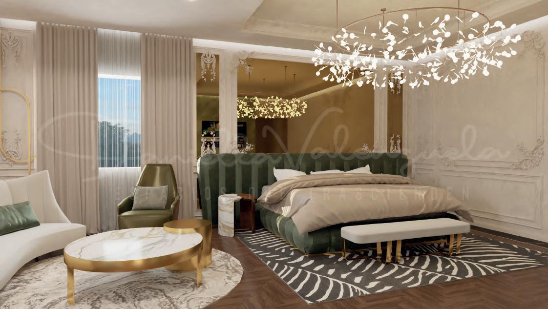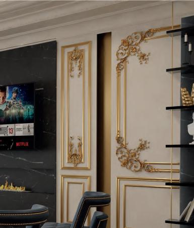 Inside the house, the sense of luxury can be experienced through ornate moldings combined with high-end Italian furniture. Each room is meticulously designed with attention to detail. Some rooms maintain the French style at its highest with light shades of color on the walls and golden moldings, while others, such as the game room, use darker colors and modern elements to create movement in the house. As one can see, each room tells a unique story through luxurious elements and carefully curated furniture.