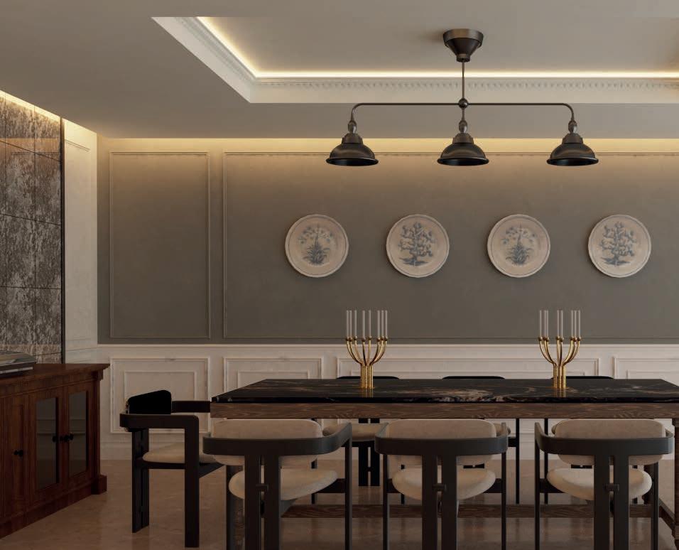 On the other hand, the main challenge for the dining and social area was to give a second life to the furniture and decoration collection that already belonged to the family. To do this, we started with a change in the lighting and color scheme of the space. In addition to this, we included some new elements that, together with the rearrangement of existing pieces, resulted in a harmonious and timeless ensemble.