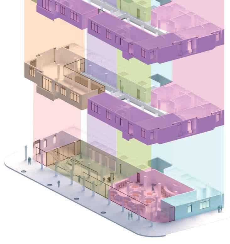 01 Preexistent building 02 Recreation program on the rooftop Aluminiun curtain structure, indirect lighting indoors Free ground floor 05 06 03 04 A double corridor is created throughout columns Perforations for views towards the park