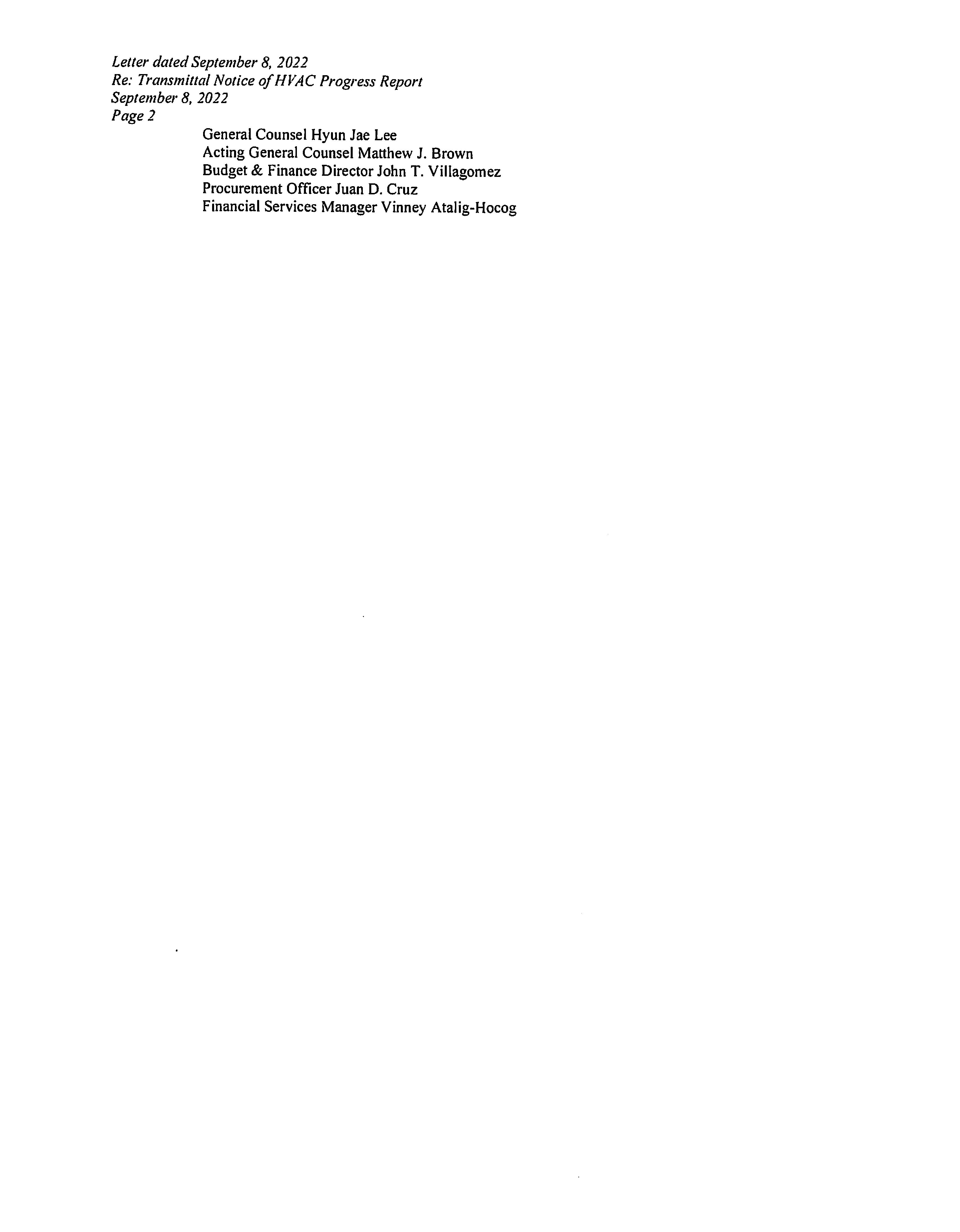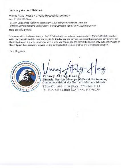 PURCHASE ORDER NO. VENDOR SCOPE OF WORK OUTSTANDING AMOUNT 678804-00 OP M.S. Villagomez Temporary storagespace for court files $3,600.00 677056-00 OP IT&E Hoisted VOIPLine and Labor and cabling $7,653.80 CONTRACTOR CONTRACT NO. INVOICE NO. DATE DUE OUTSTANDING AMOUNT DESCRIPTION WMES 672803-OC WM18-218-15 9/15/21 $10,230.16 POST AWARD SERVICE WMES 672803-OC WM18-218-15 9/15/21 $1,164.76 TRAVEL EXPENSES WMES 672803-OC WM18-218-16A 9/15/21 $6,885.74 POST AWARD SERVICES WMES 672803-OC WM18-218-16A 9/15/21 $1,716.10 TRAVEL EXPENSES WMES 672803-OC WM18-218-15A 4/4/22 $1,261.00 WINDOW A&E WMES 723906-OC WM18-218-20 2/8/22 $1,445.88 POST AWARD SERVICE WMES 723906-OC WM18-218-21 2/8/22 $1,496.72 POST AWARD SERVICE WMES 723906-OC WM18-218022 2/8/22 $2,503.52 POST AWARD SERVICE CHONG'S 698294-OC APPLICATION PAYMENT NO. 11 1/30/22 $398,686.23 APPLICATION PAYMENT NO. 11 CHONG'S 698294-OC APPLICATION PAYMENT NO. 12 1/30/22 $501,193.23 APPLICATION PAYMENT NO. 12 J&J COMPANY 710600-OC INVOICE NO. 0500121 5/10/21 $41,040.00 PURCHASE AND INSTALL FLOOR TILE (RM. 217, & 223) HBR INTERNATIONAL INC. 32200775 B22-0060 5/13/22 $76,320.00 REPAIR OF DAMAGED AND/OR DETERIORATED CONCRETE WALLS AND TRIMS