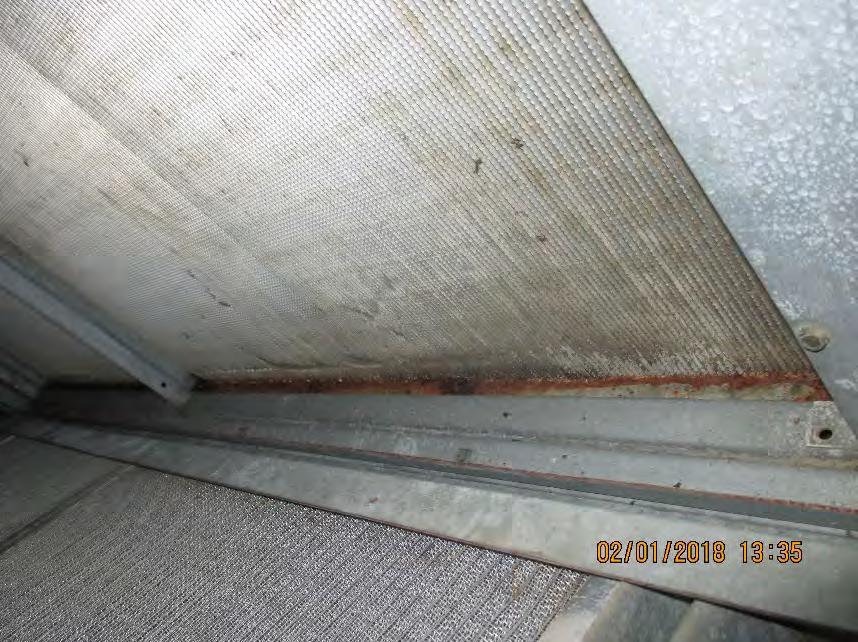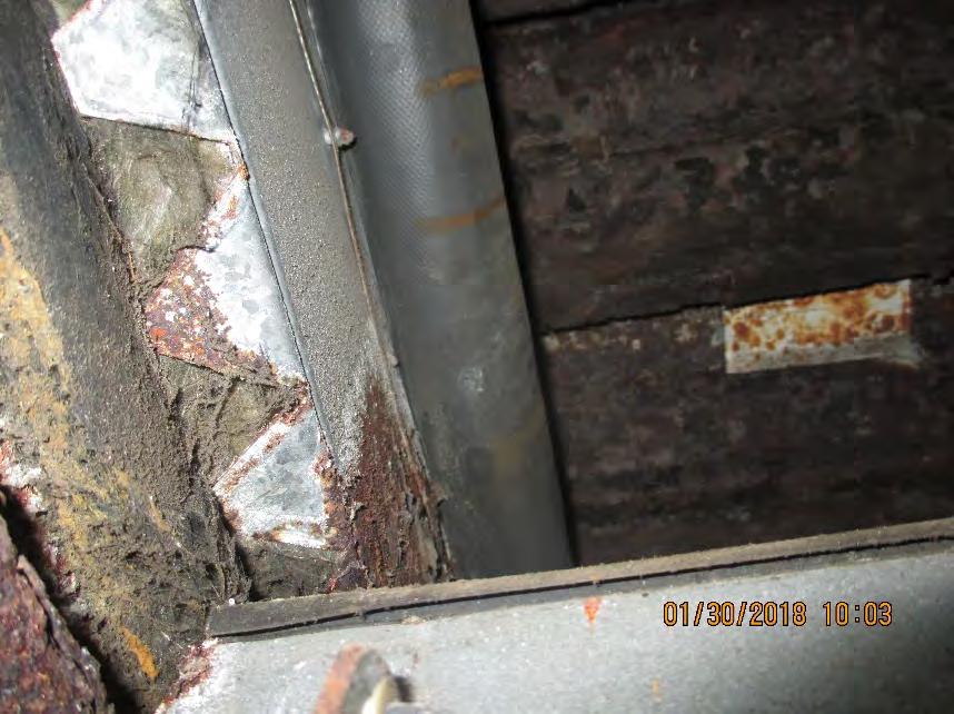 The AHU # 2 filter and filter rack were severely damaged due to corrosion, see photo 2.8. The AHU that serve the Superior Courts 202, 205, 217, 220 and 223 each has outside air damper that was shut closed and corrosion damage is present on each damper’s louver, see photo 2.9. The AHU # 3, 7, 9, 11 and 12 are installed with new outside air Manual volume damper and was also close The old actuator motor and its wiring are left inside the Mechanical Room, see photo 3.7. The AHU # 10 is installed above the ceiling of Evidence Room at Marshals Office. Unit’s Power and control wiring are pulled out of its connection. Smaller FCU was not visually surveyed because they were primarily recirculation of air within small spaces. Ductwork within the mechanical room appeared to be in fair condition except for the outside air ducts and some mixing boxes which were corroded and inoperable. Accumulation of dust and dirt are present at diffuser face and at intake louvers.