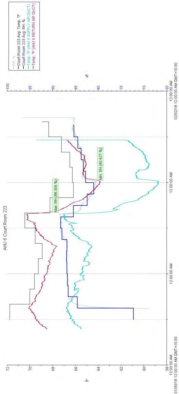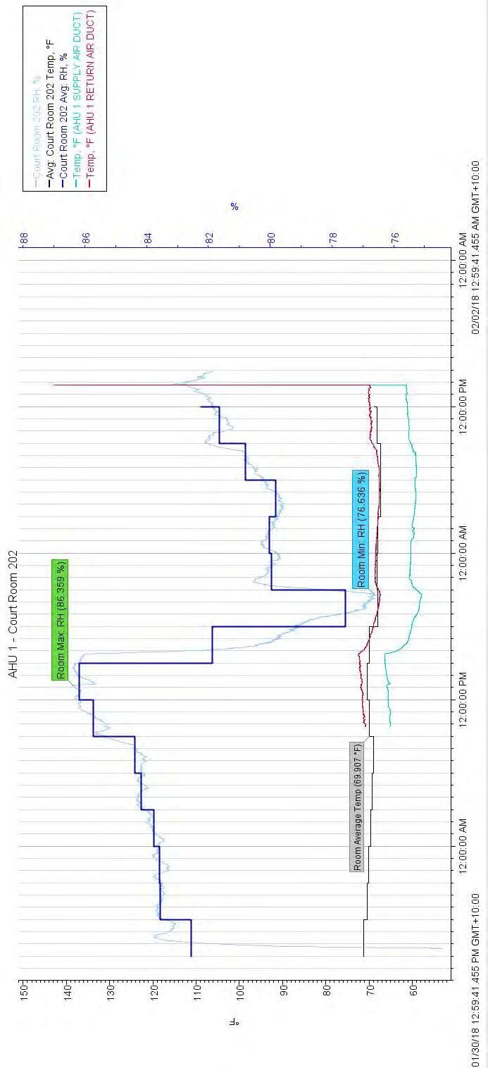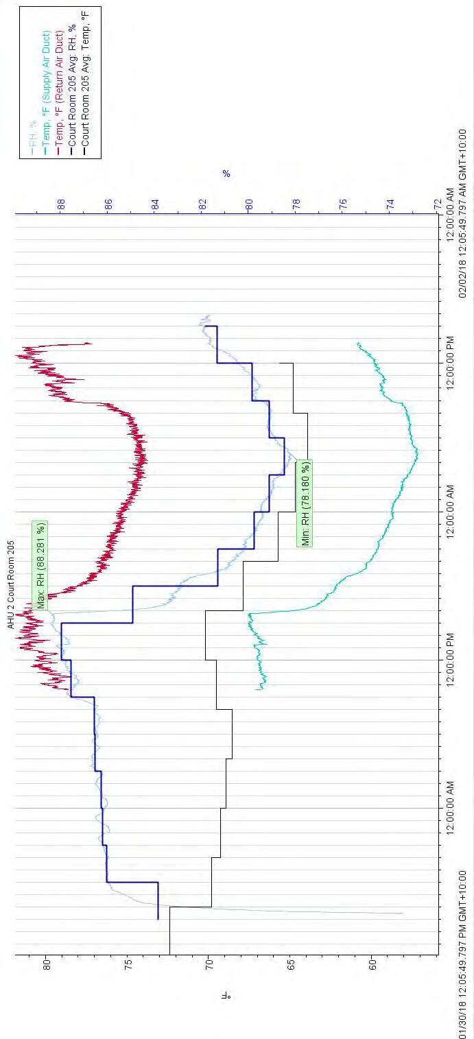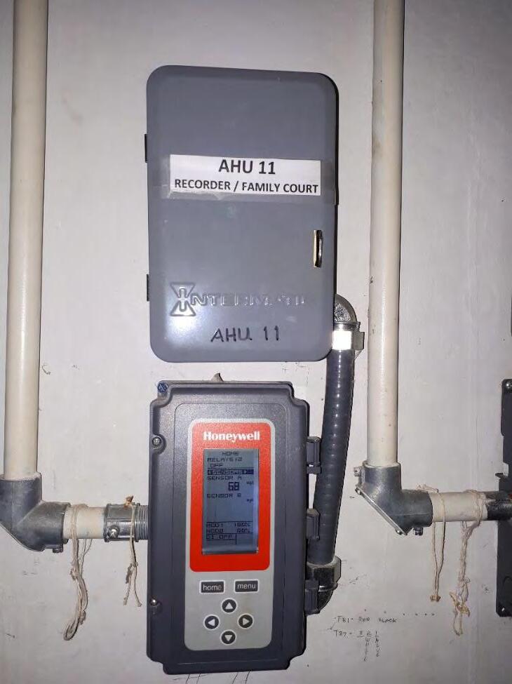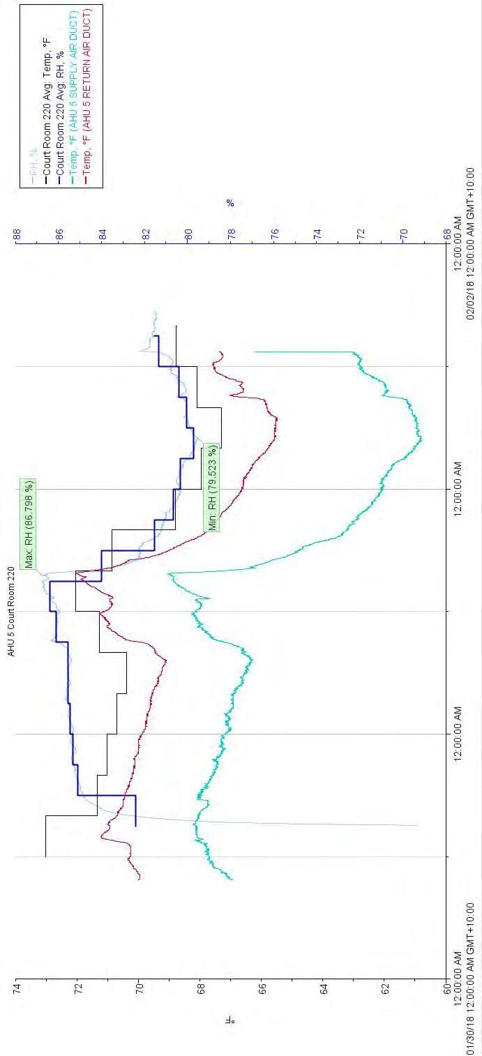 system, located on the supreme court roof and intended to cool the main entry but the capacity could not be confirmed because it is missing the nameplate data. This unit is currently not operational, and it is not known if it is still functional. The Building Superintendent stated it was not in use to reduce electric cost. There is a standalone direct expansion unit located in the ADR/Conference room area. A separate split type unit in the IT room that supplements the existing air supply near the former storage/workroom. There are three (3) 120-pint Honeywell dehumidifier was added and installed in the return duct of AHU 8, 14, and 15 that are in constant operation, but there are no plans or other design documents recording what was installed or how it was installed. The installing contractor JWS did mention that the dehumidifiers are always in operation, but it was not clear how it’s operation coincides with the operation of the AHU’s.