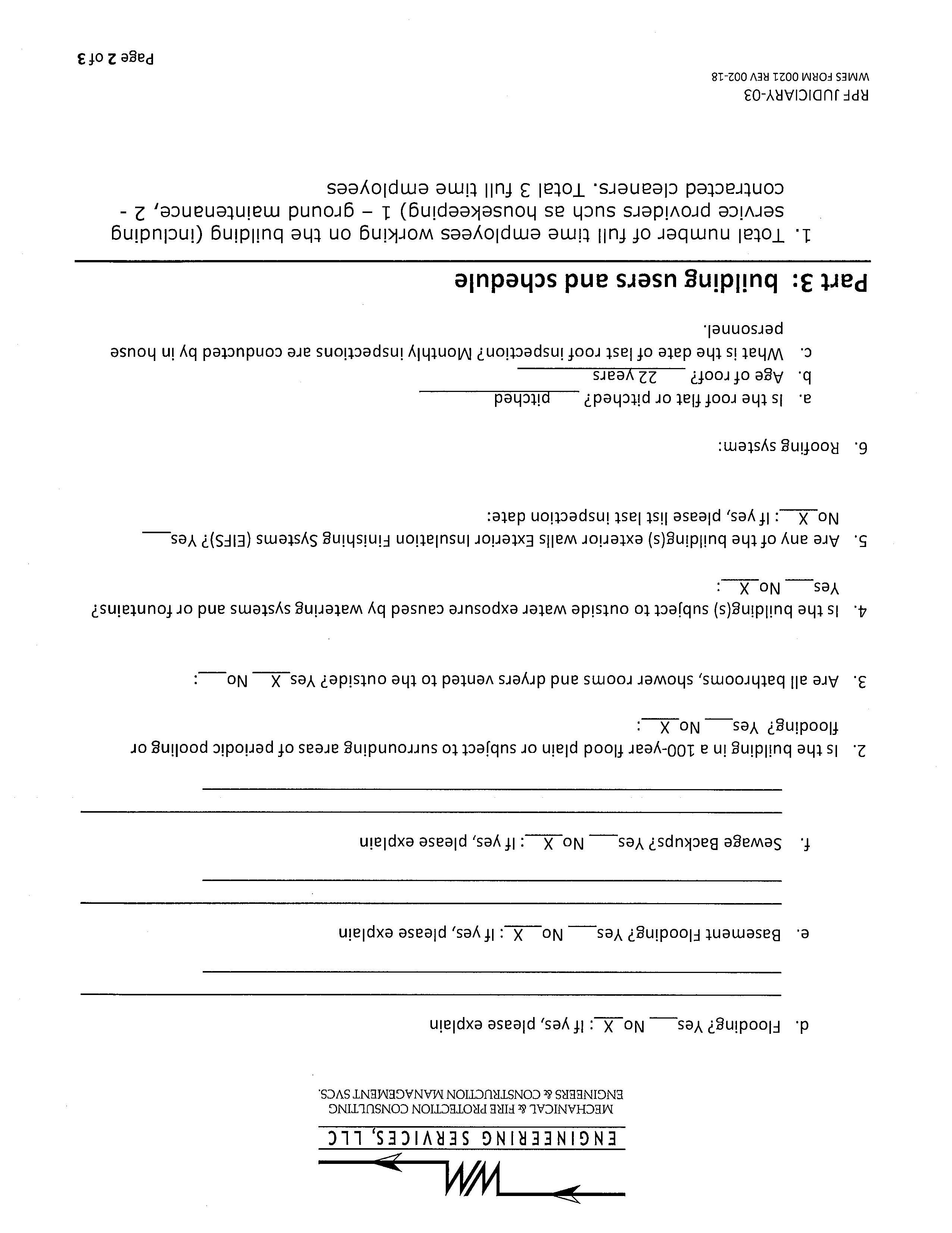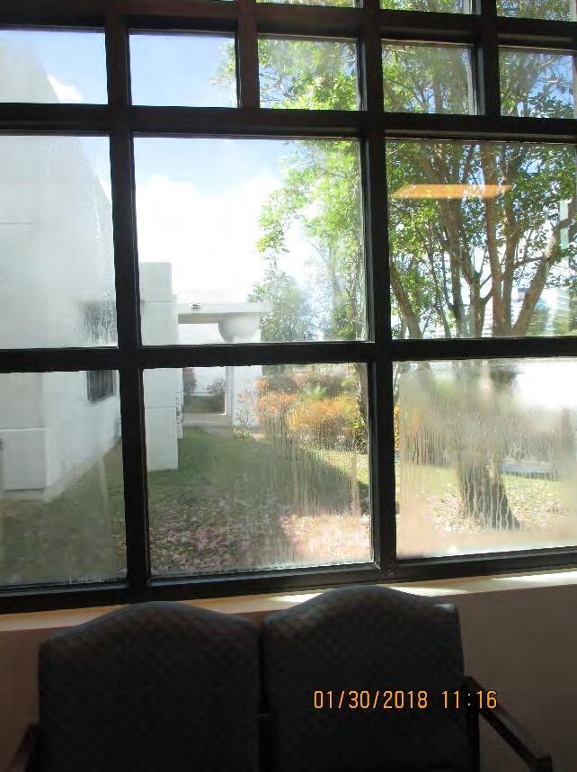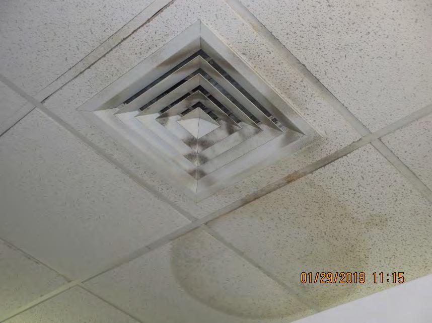 improperly sealed pipe, or duct penetrations through the walls or roof. Once the mold and mildew have occurred within the building, the best way to remediate is to remove the affected areas and maintain a dry environment. Because there has been recorded major water damage from a pipe leak and continues to have water leaks around the window, the presence of the mold and mildew will persist until physically removed from the premises. Disinfecting and cleaning of affected areas can remove on the surface but will not remove mold and mildew deep inside the material. The planned removal of the carpet and the repairs to the leaky window are a good way of reducing the sources of moisture that promote the growth of mold and mildew in the building. It is strongly recommended to dispose of all clothing in one of Justice’s wardrobe closet, furniture, books, and papers where mold is visible, see photo 5.6. There were only a few areas where building components had visible mold and mildew. No visible mold on the surface of walls and partitions. Some were found on ceiling tiles such as in Jury Room C, but they appear to be water leaks from the structure Many ceiling tiles on the first floor and second were sagging and could be an indication of high water content in the material, thus ceiling tiles should be replaced, see photo 5.2. There was no evidence of mold and mildew within the cooling coils, air filters, fans, or inside the ducts. It is highly recommended that the air distribution ductwork, air handling units, fan coil units, and diffusers/registers be professionally cleaned. Also, install more efficient disposable MERV 13 filters in the AHU’s and FCU’s to reduce the dust in the building. The fungus is more likely to grow whenever the environment suited them. A spore (seed), a viable source of food, adequate moisture in the food source and acceptable temperature are the four (4) elements that molds needed to grow. Over the years, the building where exposed to several types of water damage. Without a proper water removal or drying, moisture remains entrapped in the surfaces. Introducing cool-dry fresh air into the space help help lower the humidity level in the space. With the lack of fresh air due to the closed fresh air intake dampers and the broken exhaust fans, the musty air is only circulating within the space through the air handling units The only air that may exfiltrate or leaves the building is from people moving into and out of the building through the main entry, back entry, delivery areas, and other less used exit doors.