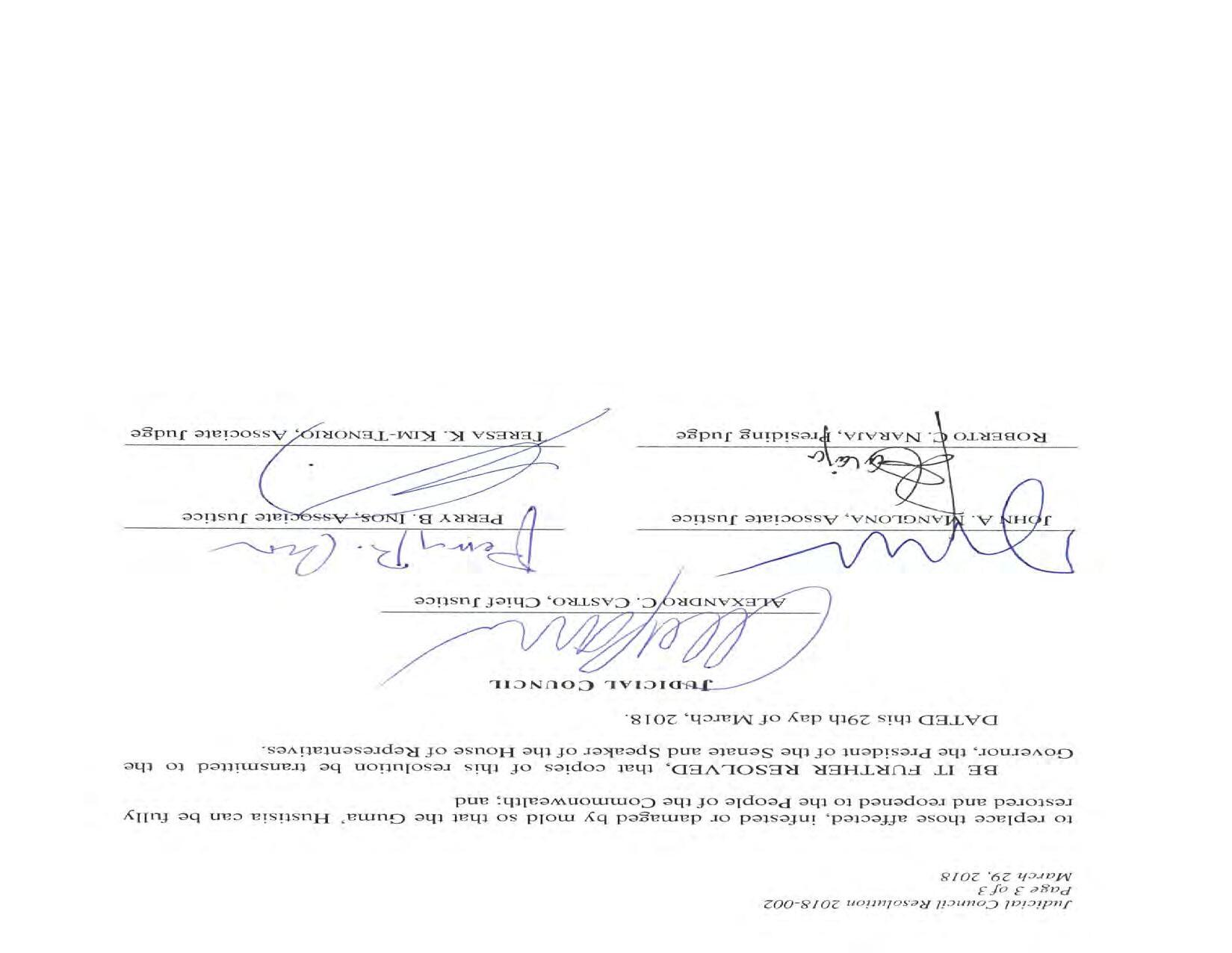 On Thursday, March 22, the Judiciary released its First Preliminary Report on the Guma’ Hustisia Air Conditioning and Mold Removal and Remediation Project. In the March 22 Preliminary Report, we provided background on the air conditioning and mold issues plaguing the Guma’ Hustisia. We also detailed the steps the Judiciary has taken to manage the building’s closure since the air conditioning shutdown on Friday, March 16, as well as outlining our shortand long-term goals for managing the Judiciary’s operations and restoring the Guma’ Hustisia. Please refer to the March 22 Preliminary Report for such information.