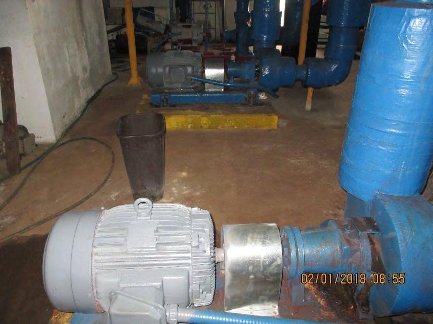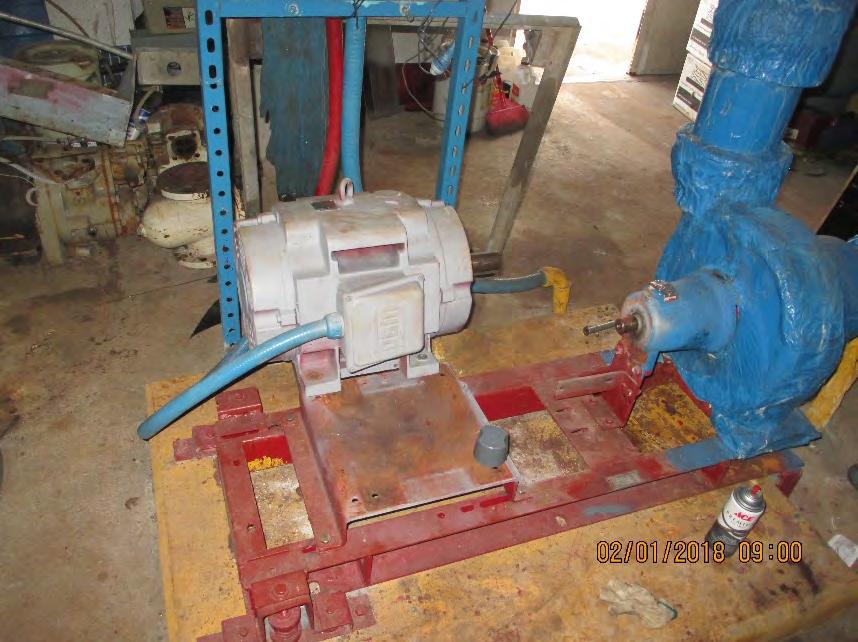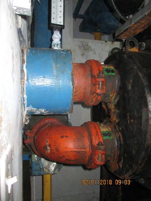 Based on existing plans the chilled water pump is end-suction pumps rate at 240 gallons per minute (GPM), 120 feet total dynamic head pressure, and 25 horsepower. Currently, the newly installed chilled water pump number three (3) is down for repairs. Pump gages are not calibrated or broken so pump pressures could not be confirmed. The remaining 2 older pumps appear to be in fair condition, and the pump base and foundation are in fair condition. Originally the chilled water pumps were interlocked to operate with its associated chiller but appear to be manually operated. The indoor chilled water piping and insulation remained intact. Chilled water components are in fair conditions, but the surface of piping showed signs of corrosion, see photo 1.1.