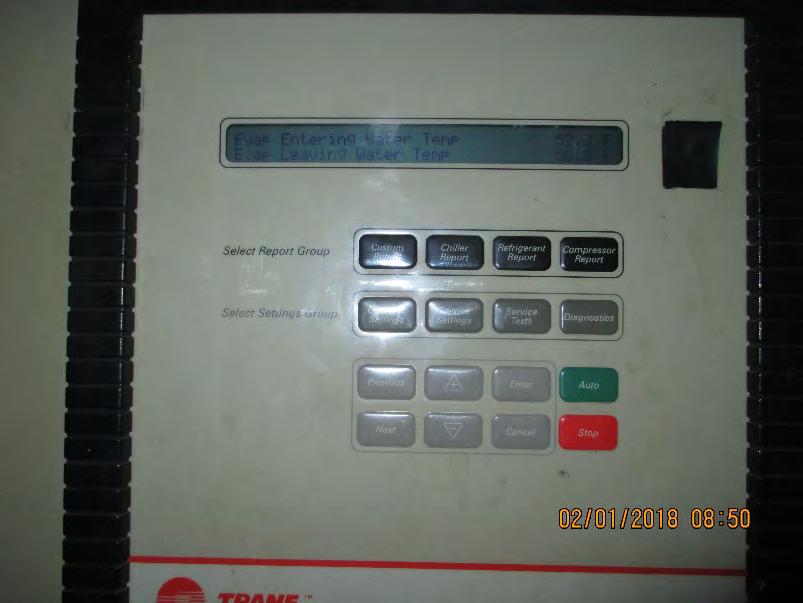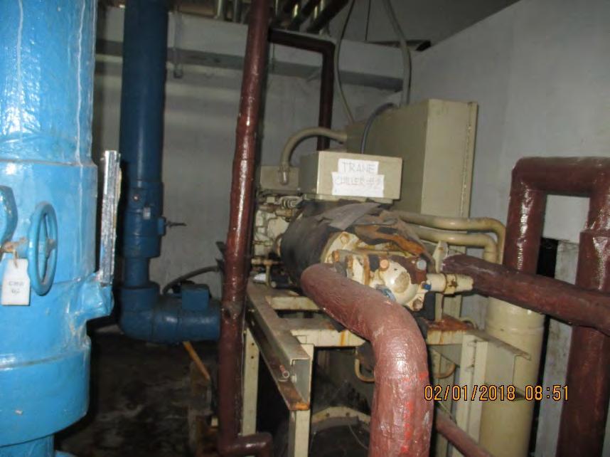 two TRANE chillers as back-up. The Smart DT chiller utilizes R134a refrigerant and the TRANE chillers both are R-22 type refrigerant. During the survey, the Smart DT Chiller was down for repairs and the two TRANE chillers were operating but only at 50% each due to compressor or refrigerant circuit issues on each chiller. The existing remote aircooled condensers were on the roof but were not accessed. The current leaving chilled water temperature conditions at 52 degrees F and returning at 56 degrees F, See appendix photo 1.0