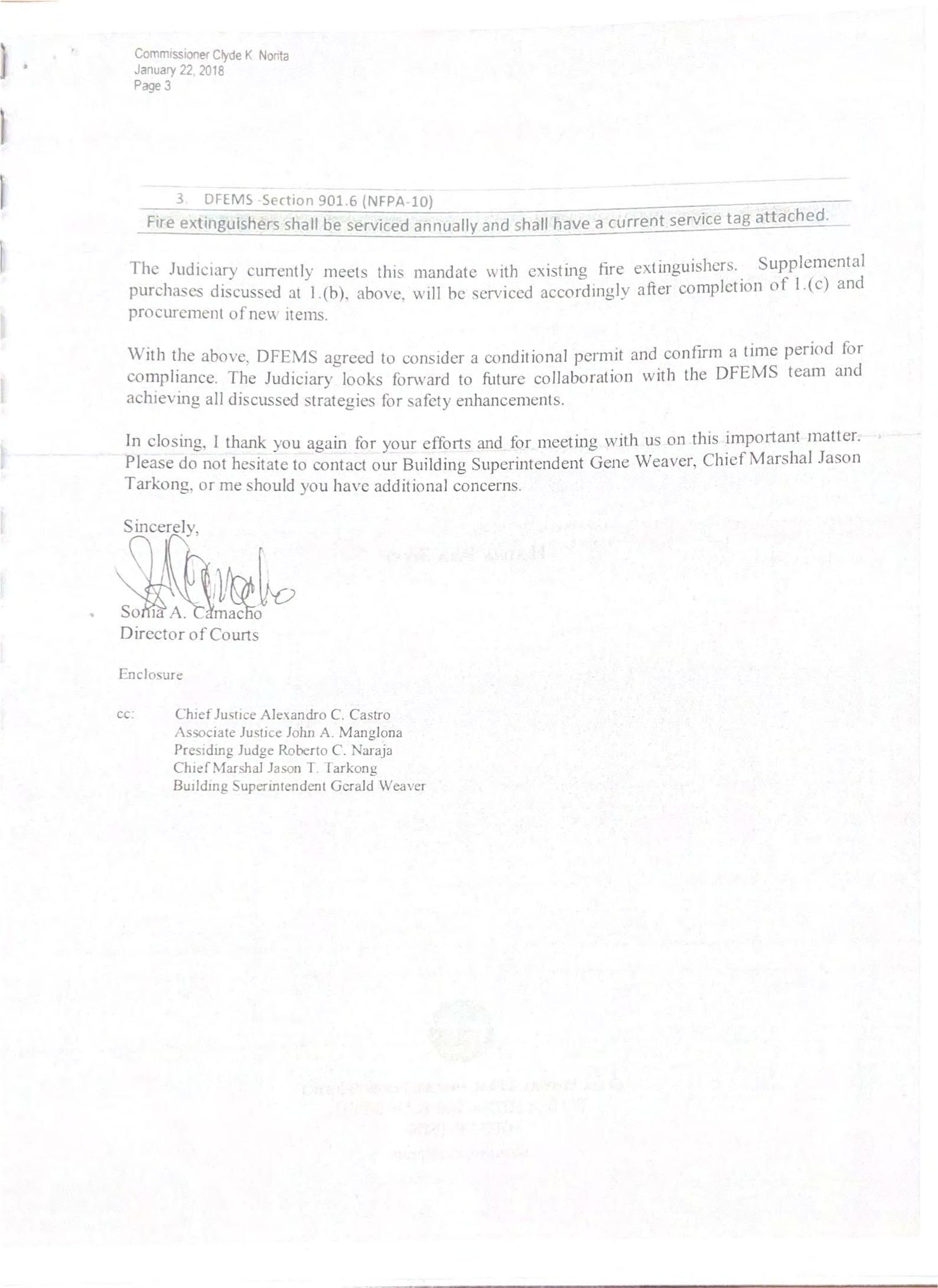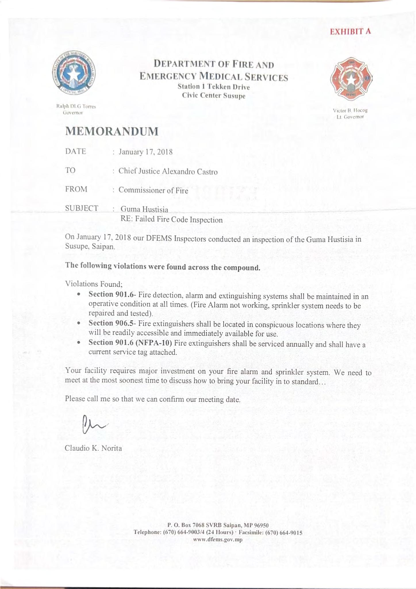Exhibit G DFEMS Memorandum re: Failed Fire Code Inspection of Guma' Hustisia