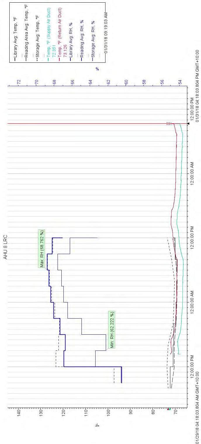 The design has a change of temperature of the entering and leaving temperature 10 degrees F with water entering at 45 degrees F. This should create a drop on air temperature across the cooling coils of 15-20 degrees F. Currently the existing temperature entering and leaving the coil is only 4 degrees F and the temperature drop across the cooling coils are only 1 to 3 degrees F. The elevated entering chilled water temperature at 52 degrees F reduces the AHU to reduce temperature and lower the relative humidity in the room. When the AHU’s capacity is oversized for space, the temperature can be met quickly and not allowing moisture in the air to condensate at the cooling coil. The psychometric process of air conditioning cycle is to cool and dehumidify the air as it reacts to meeting the thermostat setpoint.