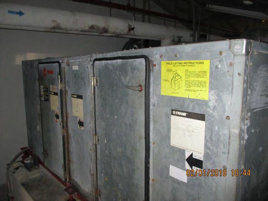 The air side of HVAC system consists of chilled water type Air Handling unit and Fan Coil units which distributes air into the various rooms within its respective zone via an insulated steel duct system. There are 16 large AHU ranging in capacity of 10 TON to 25 TONS of cooling. The smaller FCU consist of 8 units and range from 1 TON to 2.5 TONS of cooling. The AHU’s are single zoned, constant volume unit and have a mixing-filter box with washable filter. There was originally motorize dampers on the outside air and return duct, but they are not operational. The original automated controls have been disabled and the AHU’s are being controlled locally by a temperature sensor in the main return duct within the mechanical room and a thermostat controller on the mechanical room wall. There is also a timer installed within the mechanical room but was disabled for the most part. There is also a large TRANE package type unit, independent of the chilled water