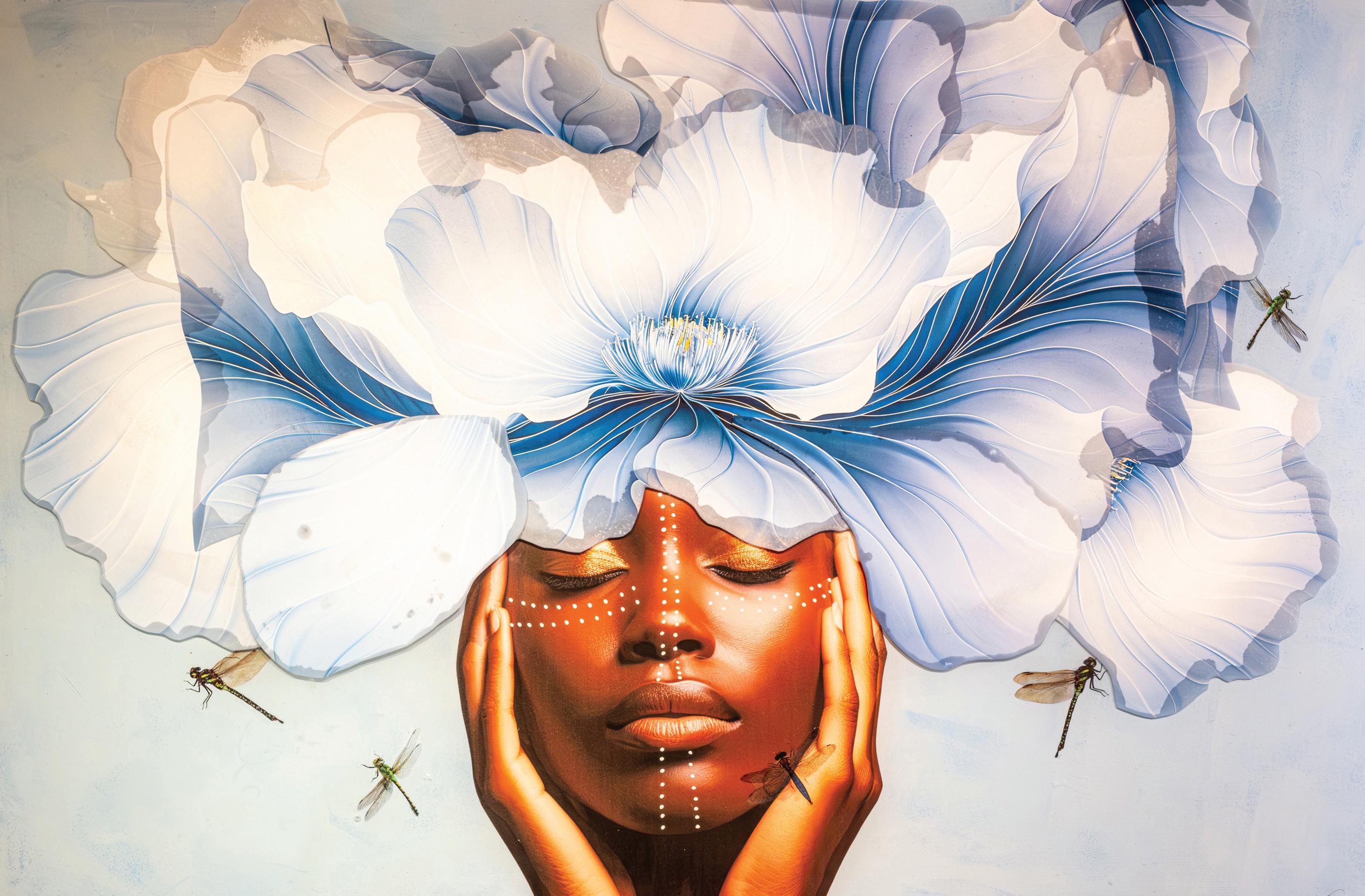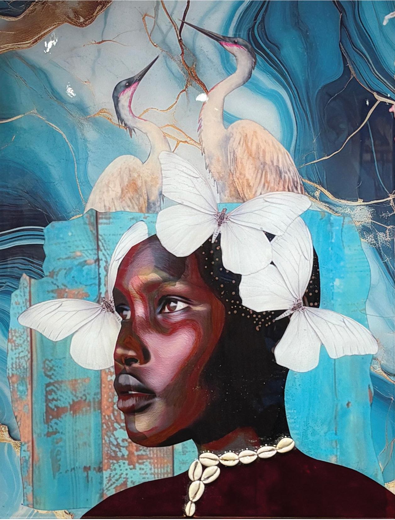 Frame’s art goes beyond visual beauty. There is an innate spiritual power to the pieces that connects each portrait to something larger. “Africa is imbued with spirituality, reflected in various traditional beliefs and rituals. This spiritual connection serves as a personal muse, inspiring me to explore the interconnectedness of all beings, inviting viewers to contemplate the deeper meanings behind my work,” she says.