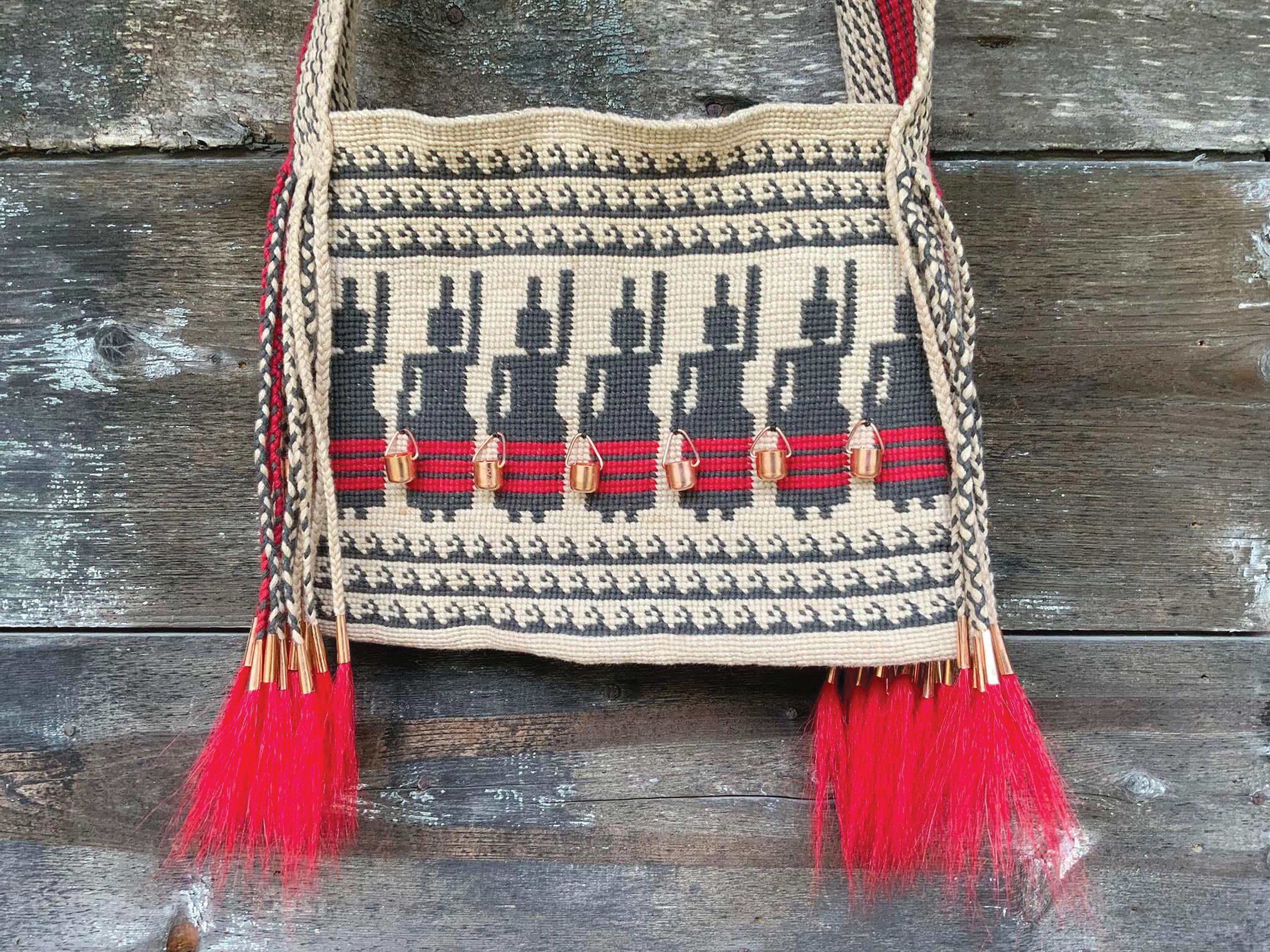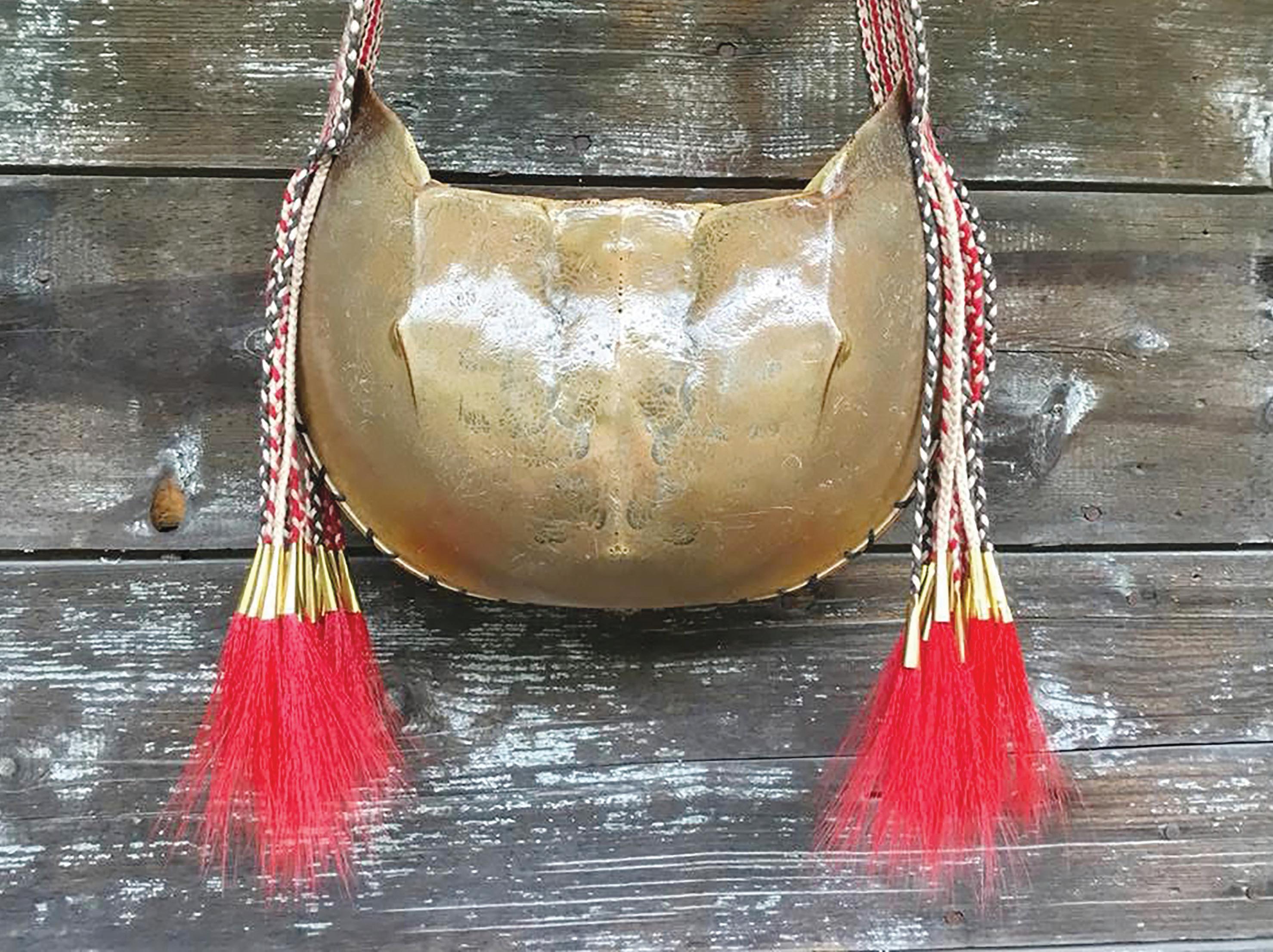woven strap, copper cones, and dyed deer-hair tassels. “I was fortunate enough to see an antique horseshoe crab bag when I was young,” she says, “and I knew immediately that I would someday make one. I went off my memory from childhood.”