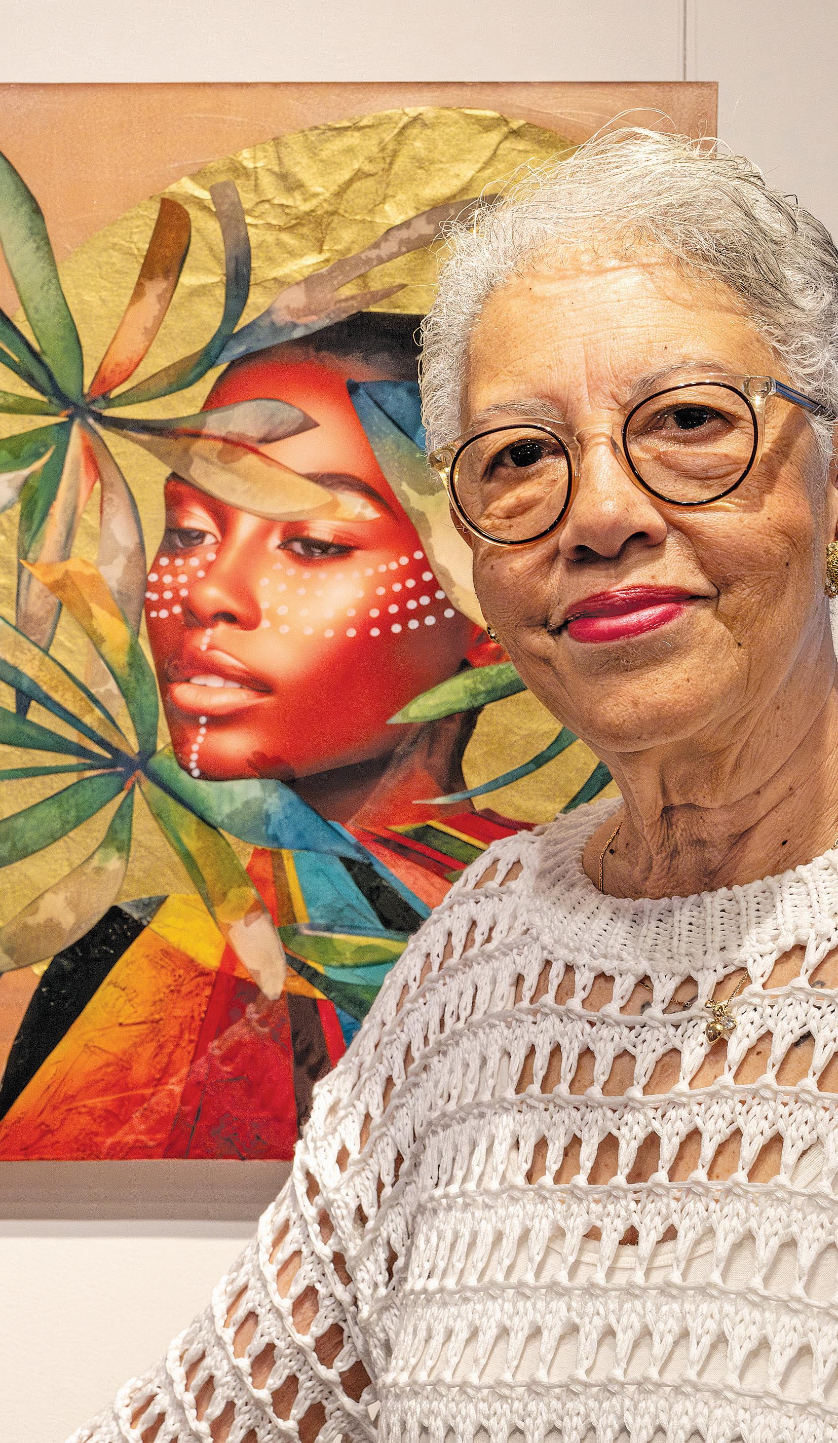 Frame’s initial response was to create arresting 24- by 6-inch African figures, or dolls, which she dressed regally in traditional African garments, the same textiles that now populate her mixed-media collages. For Frame, each figure’s majesty and beauty evokes a sense of heritage. “Those dolls, they joined me in an expression,” she says.