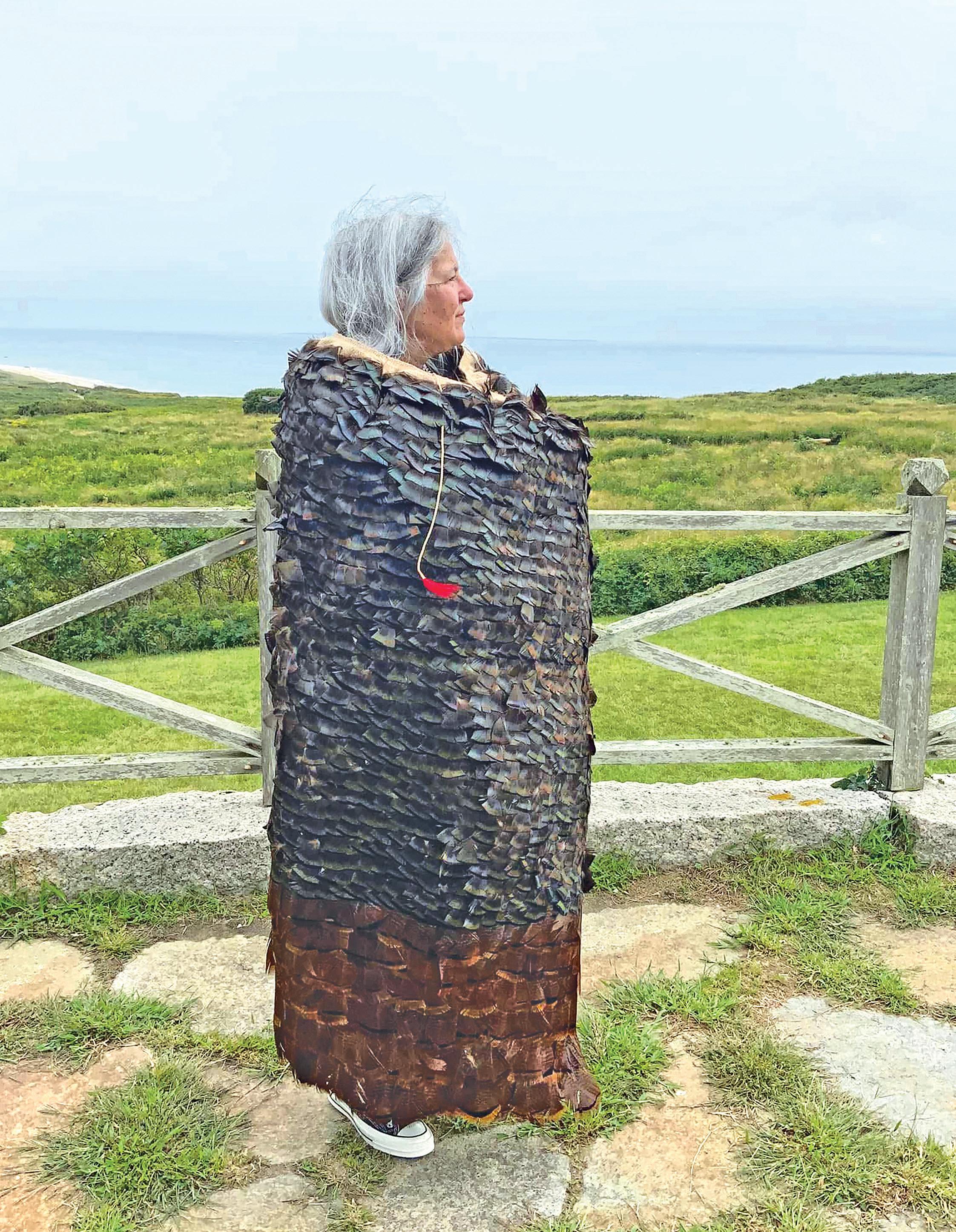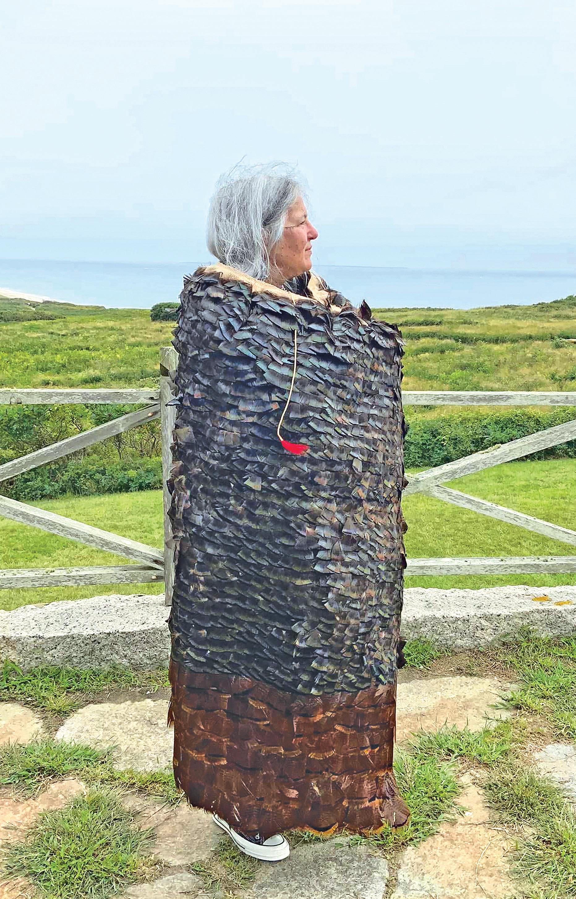 about these at 35; hers is the first Aquinnah Wampanoag one made in 400 years. “Someone of high status would wear the mantle,” says Marden. “They are the height of our twine work.” Approximately four feet long and six feet wide, this took Marden about a year to construct, working on two rows a day, each row taking some two hours. Sorting the feathers for size and shape alone took about two months. The impressive work made its debut at the Aquinnah Cultural Center in 2023. It has traveled to other sites, and will eventually be displayed at the Museum of Fine Arts in Boston.
