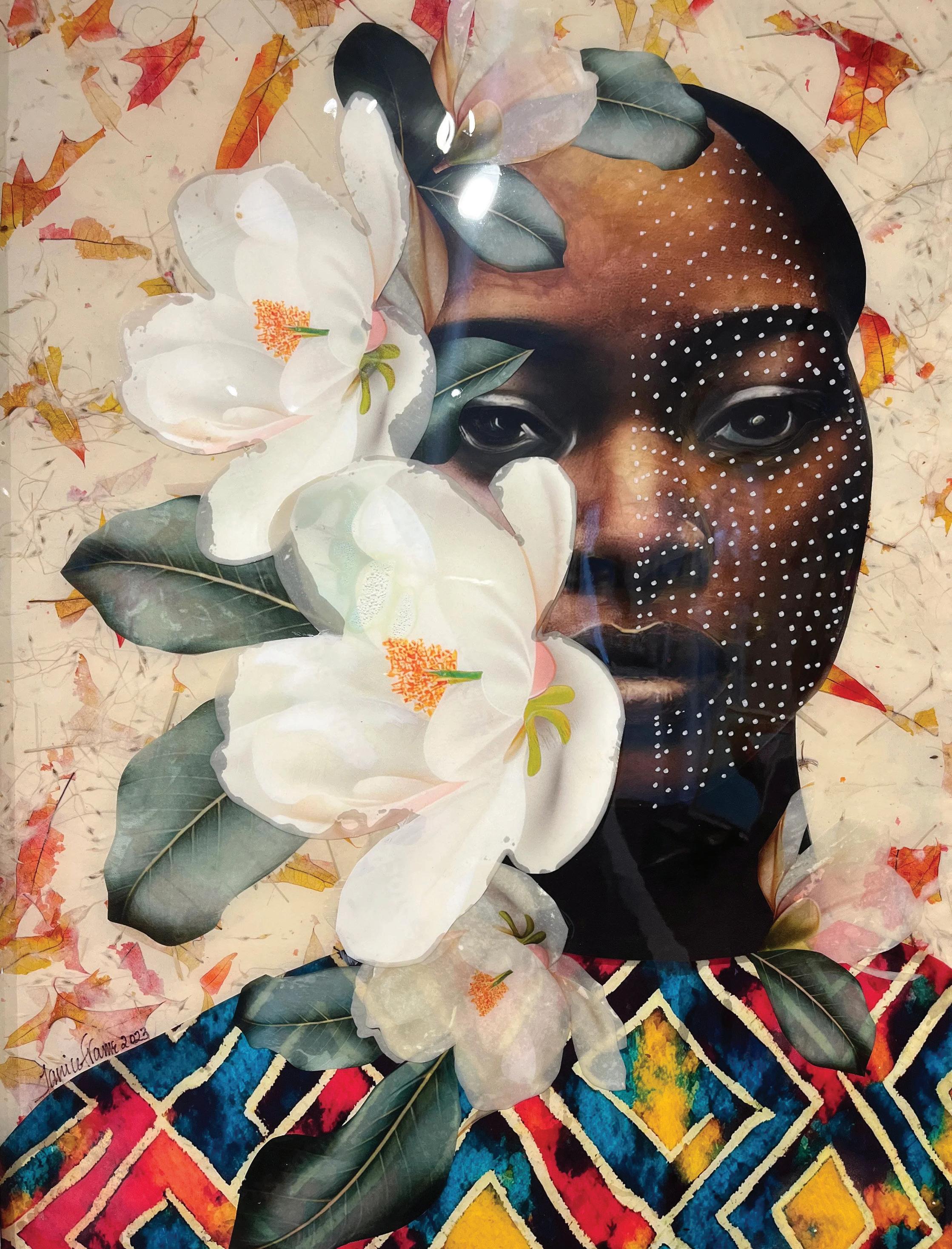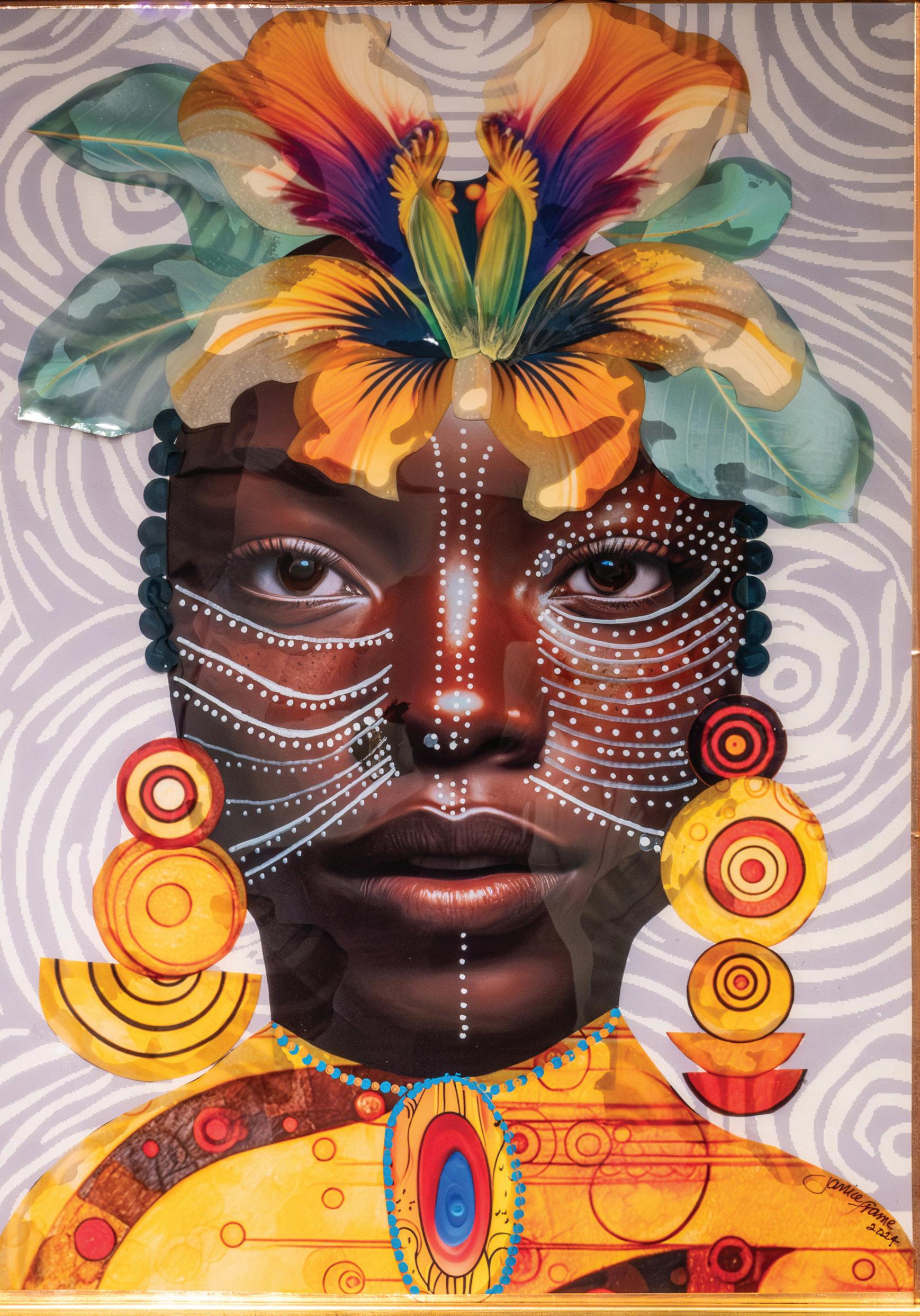 One of Frame’s earlier works in the show, “Facing Myself, Facing My Beauty,” exemplifies this sentiment. Two regal heads gaze up and outward. The golden hues and flowing hair meet in a transparent orb, lending a celestial air: “I am trying to awaken African Americans here who don’t understand our dignity, royalty, and power, that they need to face who they are,” Frame says. After selecting an image, such as the one in “Etched in Tradition,” Frame delves into research on ancestors, spirit guides, tribal dress, adornments, traditional tales, and other aspects to inspire her artistic interpretation: “My works are not documents. I take creative license to create my own world.” She then prints the image, which serves as the jumping-off point, laying it down on a background of patterned rice paper and enriching the composition with additional cut paper, paint, and small elements such as cowrie shells and beads, which add a three-dimensional quality to the work. The resulting artifacts, face painting, and motifs symbolize tribal identity and status, as well as broader themes like fertility, power,