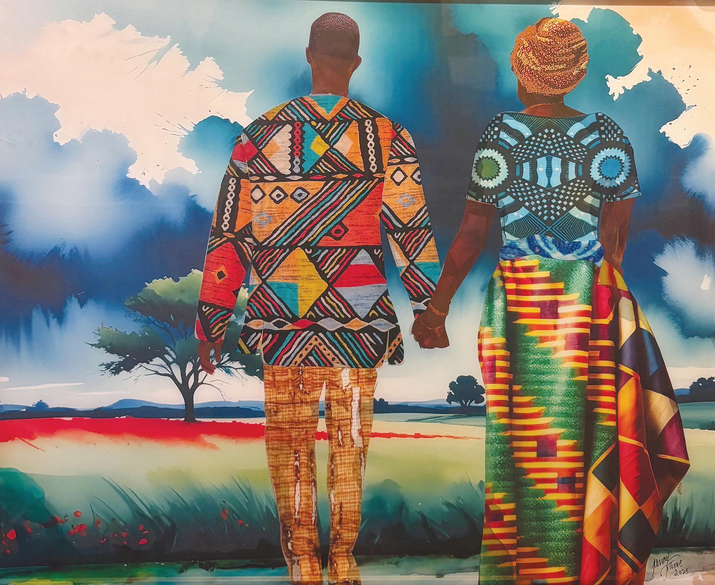 Her piece “Shared Visions, Beyond Today” is a poignant example in which a couple stands, hands clasped, backs to us, looking out over the vast African landscape, reminiscent of a veld, rendered in translucent and opaque watercolor. Frame explains, “Couples have to hold on to each other today to move forward. They depend on each other in this climate. Black men need Black women, and Black women need Black men.” Frame says about her series, “My goal is for Black viewers to see themselves represented authentically and with dignity. Until we understand who we are, we’re lost. For non-Black audiences, it’s an invitation to view Africans as complex, nuanced individuals. My art is a reflection of humanity and aims to evoke a sense of shared experience.”