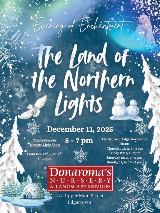 The Vineyard community knows how to celebrate the holidays. We don’t mess around! A mustsee is “Christmas in Edgartown” — a magical experience for folks of all ages. Main Street Edgartown is beautifully decorated with twinkling lights, wreaths, and Christmas trees, and the Vineyard Preservation Trust’s historic buildings add old-world charm to the festivities.