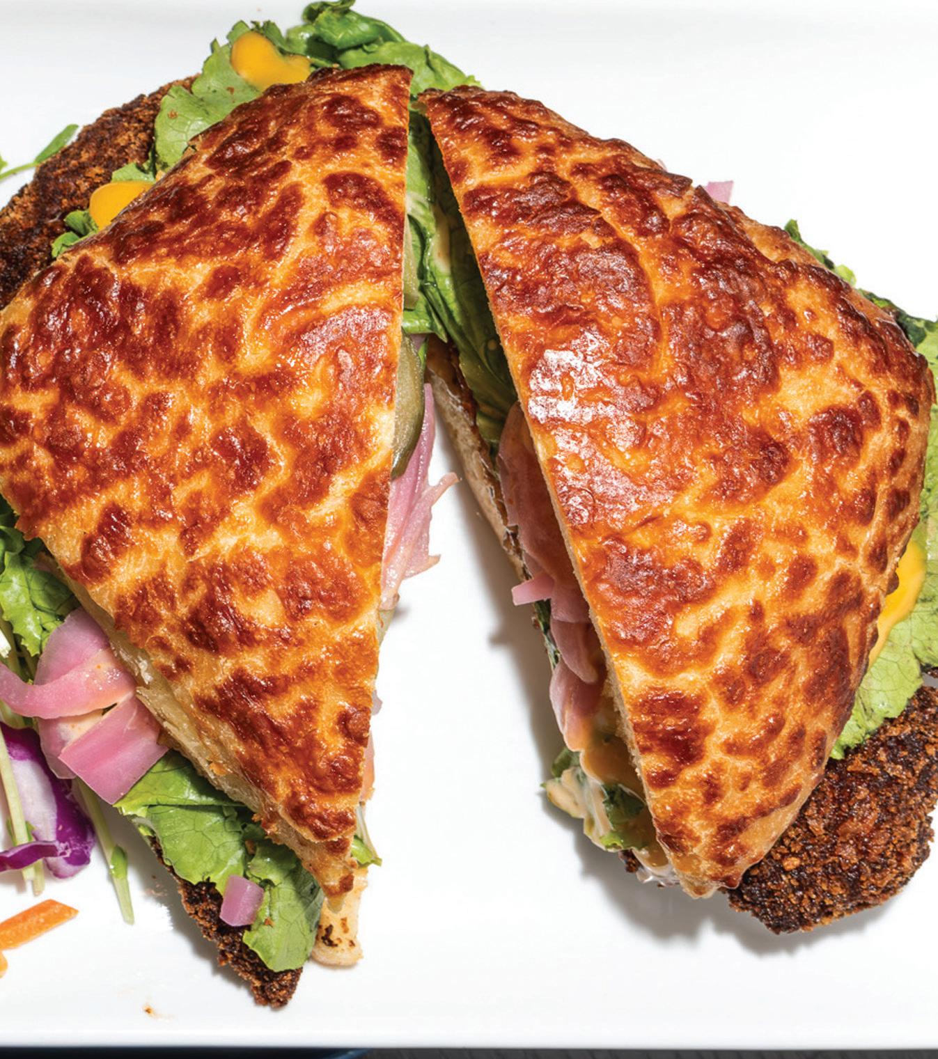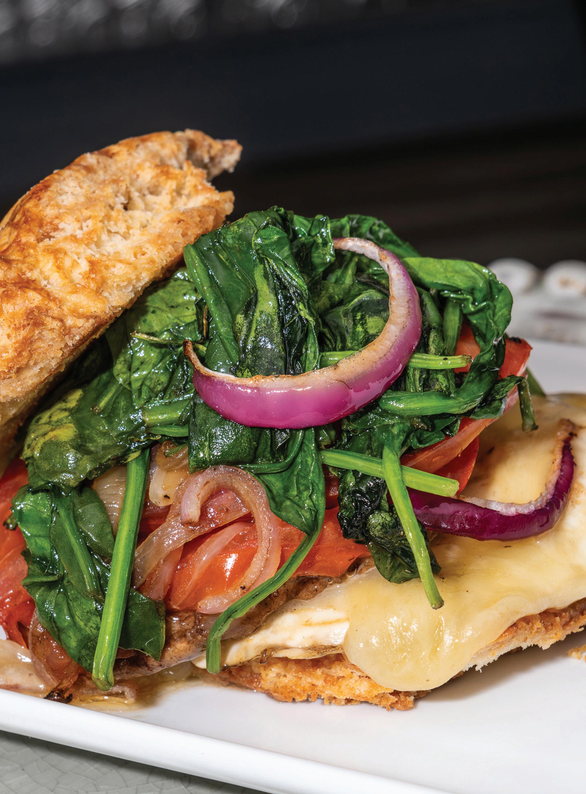 made with homemade biscuits, eggs, and options to add bacon, sausage, spinach, and onion. For lunch, Fire and Honey Chicken Sandwich, Falafel, and French Onion Grilled Cheese fly off the shelf.
