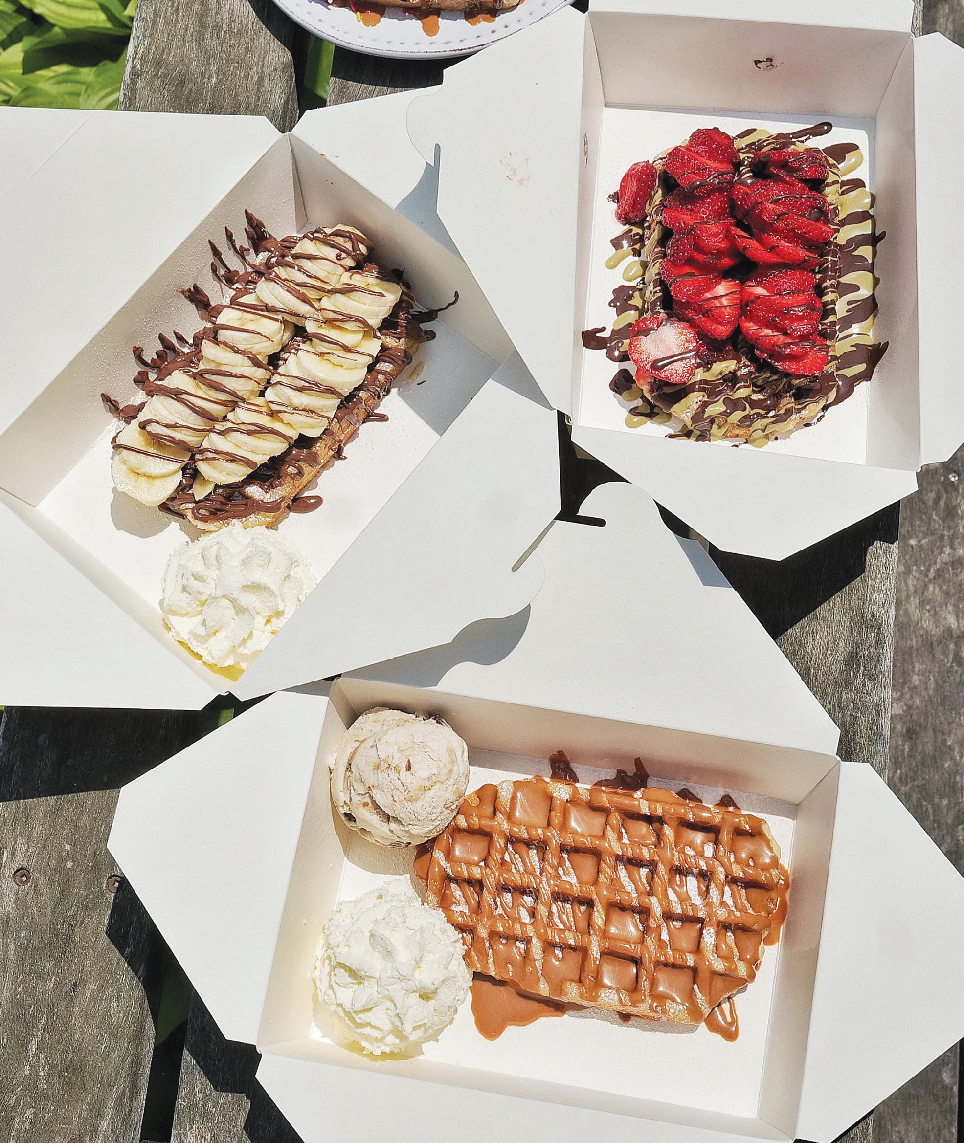 topped with banana, Nutella, whipped cream, melted chocolate, strawberries, caramel sauce, Speculoos, Vermont maple syrup, and pistachio cream. Waffles can come à la mode with a variety of ice-cream flavors from the Ice Box, ranging from chocolate to toasted coconut.