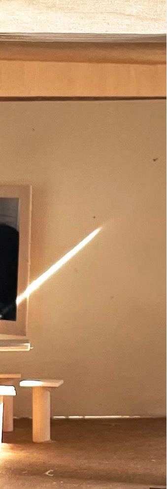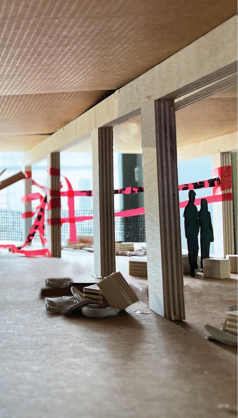 Up the stairs, the third floor lies in ruins. Lucia’s mind is shattered and she has lost all sanity. The space is chaotic, with remnants of the life she hoped to build scattered, walls crumbling—mirroring her disintegrating love and life.