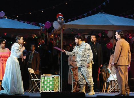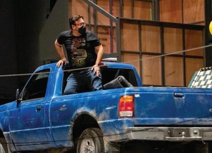 The contemporary setting calls for obscure props and the live video calls for attention to detail both in the props and dress. They designed magazines for the mini mart, created a conveyer belt, and brought 3 cars on the stage. The props are a light source and add to the lighing and overall feeling of the opera.