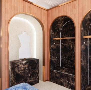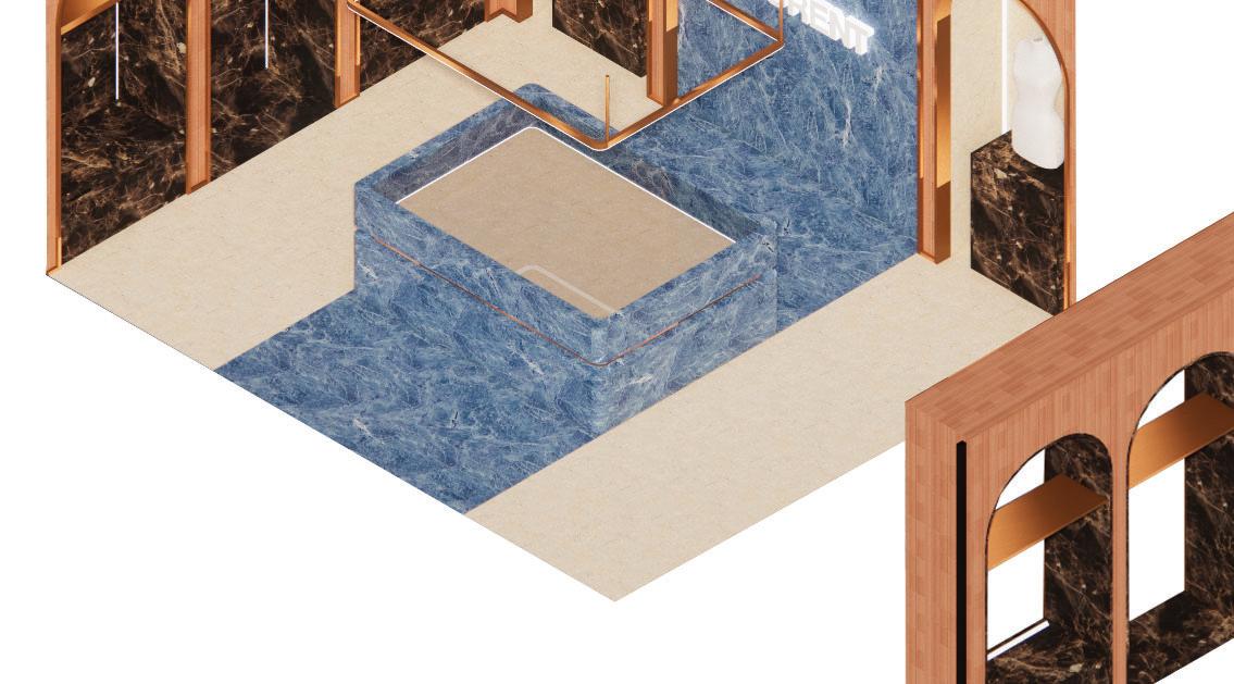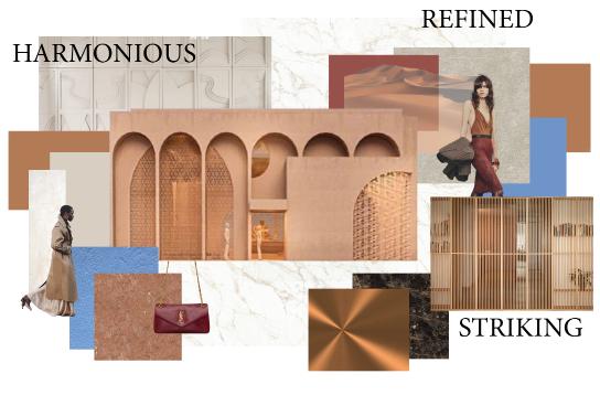 This design draws on Yves Saint Laurent’s connection to Marrakech, incorporating Moroccan colors, textures, and courtyard-inspired layouts. Terracotta, dark marble, and a bold blue accent add warmth and vibrancy, balancing the brand’s minimalist elegance with a fresh identity rooted in heritage.