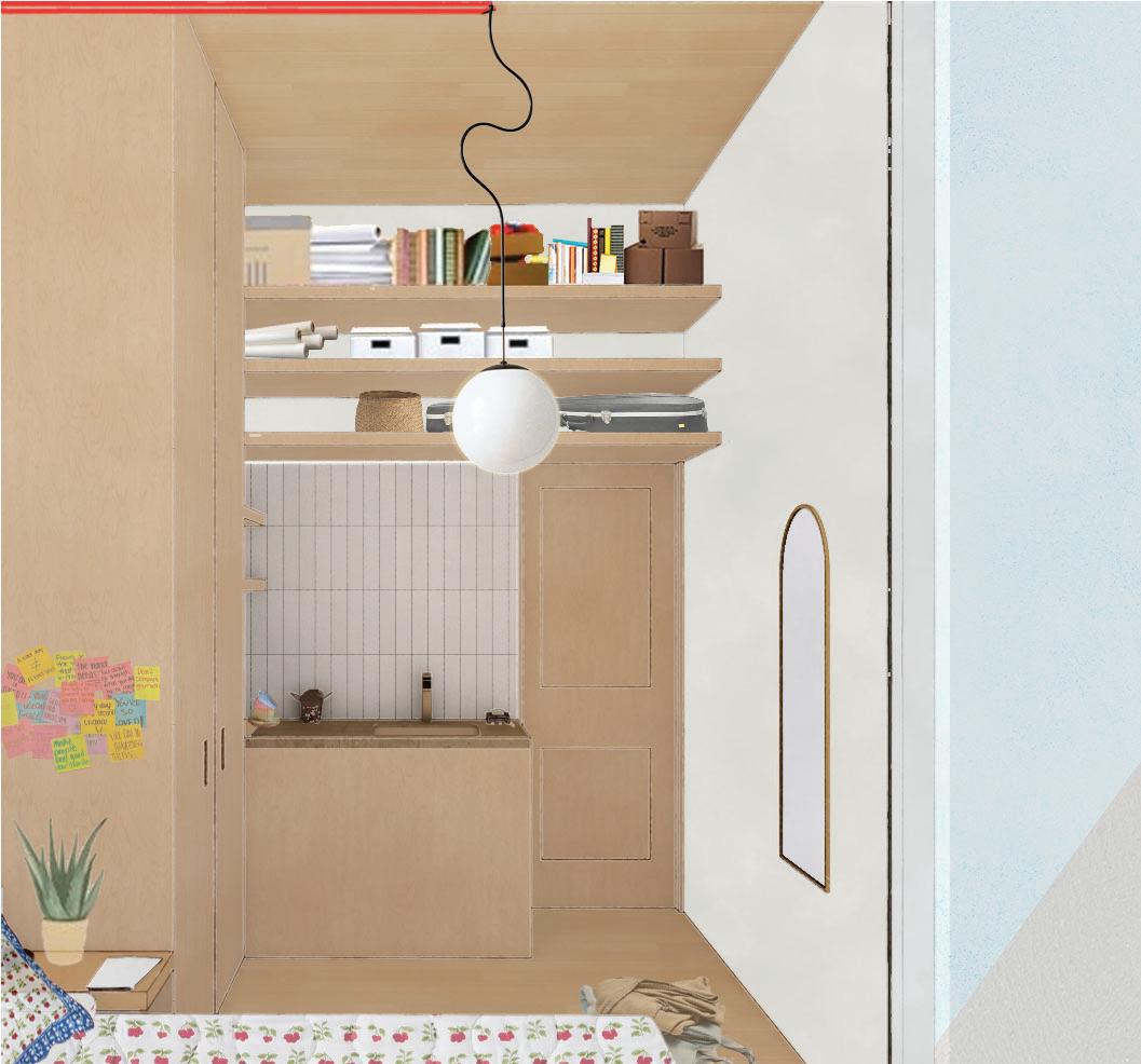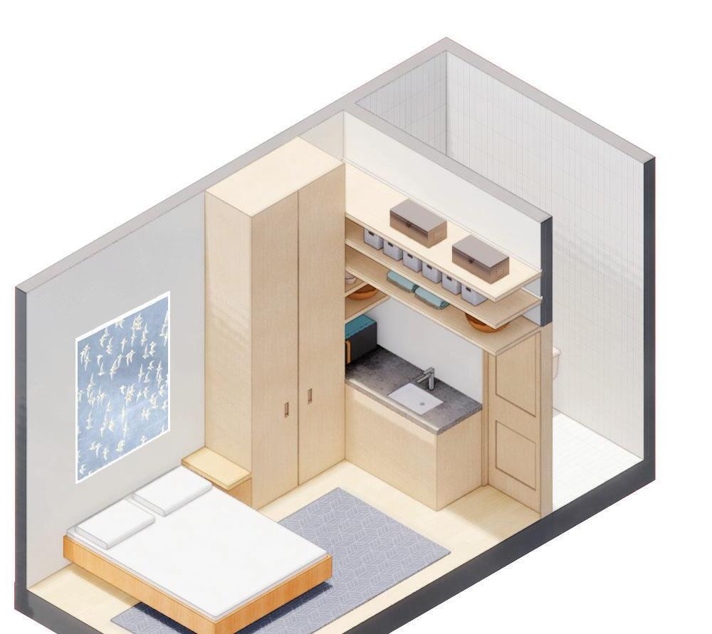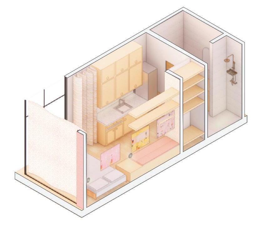 Tenants have the freedom to decorate their residences as they would like. The prefabricated units are moved into the building with a crane into communal clusters with kitchen and living spaces in the voids. The ground floor is home to a market, reception, laundry and fitness areas with a generous courtyard bridging the two buildings.
