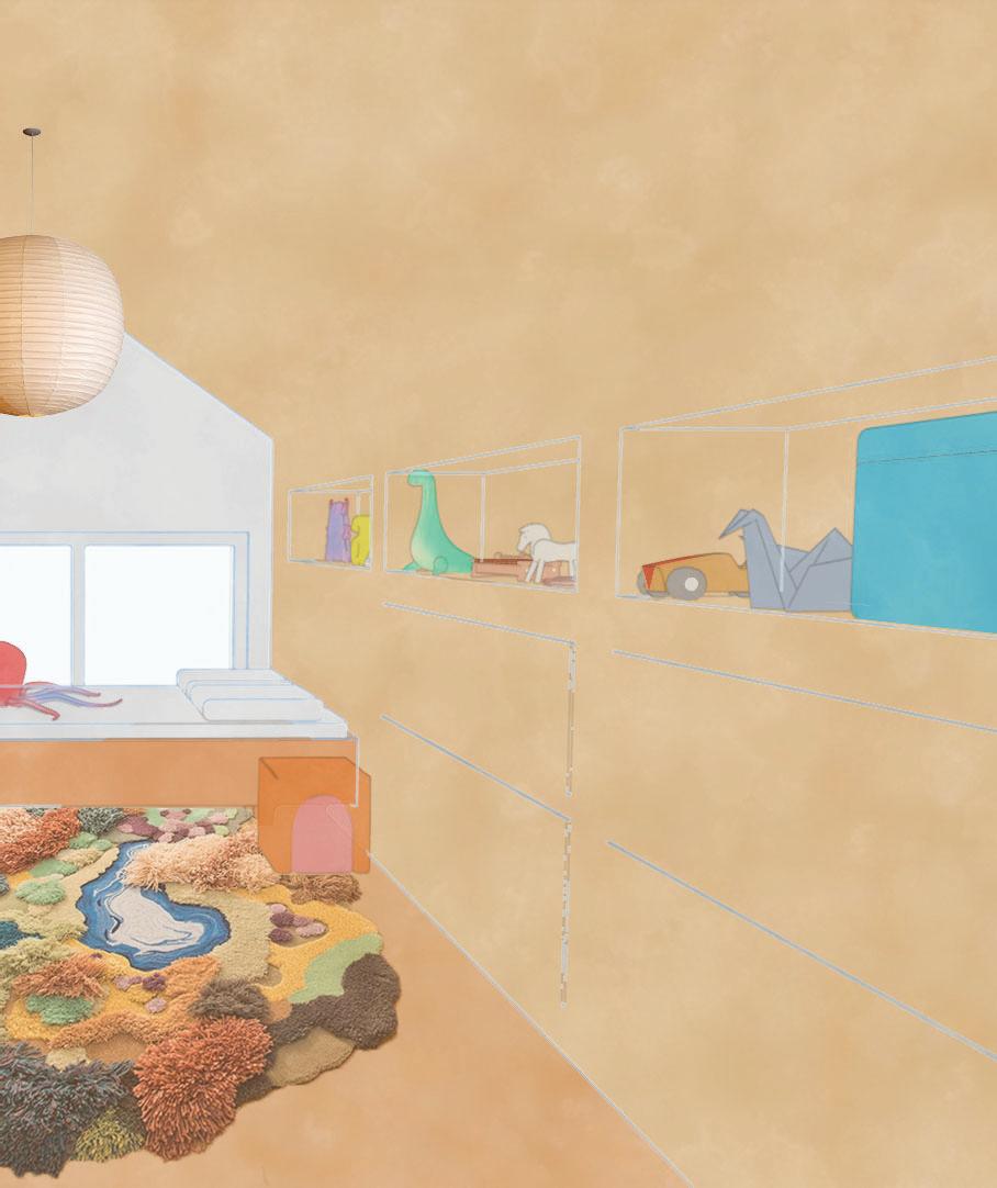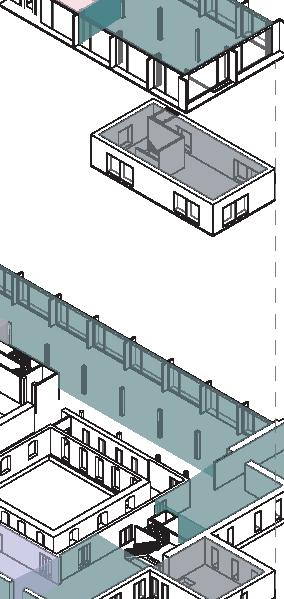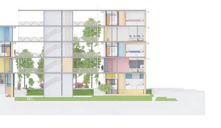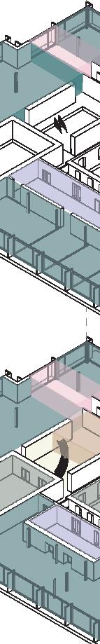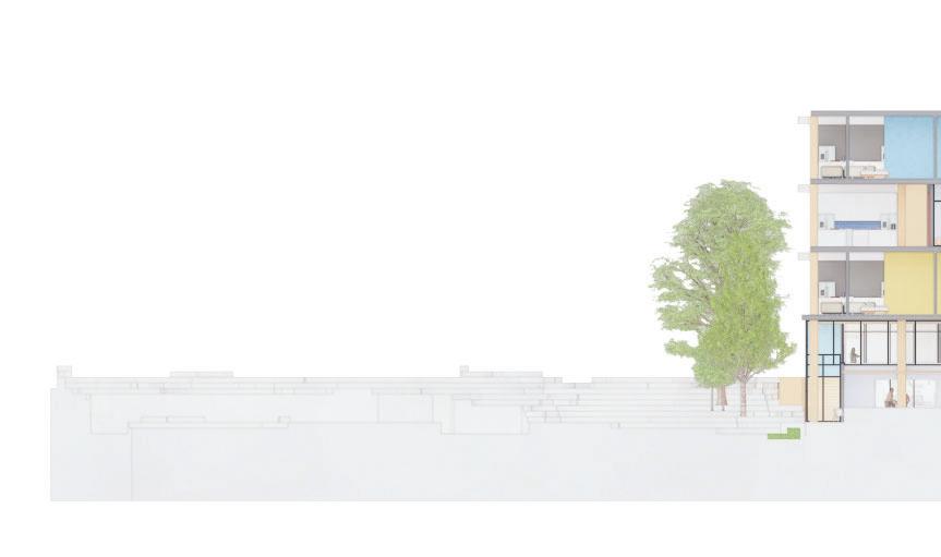 As a reiteration of the previous project, this is a final solution realized in collaboration with Sofia Hickey and Amaury Ndagijimana. The Nest celebrates individuality, offering tenants a blank canvas for playful color and personal expression, while community-oriented living spaces encourage connection and collaboration in daily routines such as cooking and working. Layered spaces are crafted through a thoughtful facade and the arrangement of units, creating a dynamic, ever-evolving experience. Prefabricated units introduce adaptability, a sense of impermanence, and flexibilit y that enhance the vibrant environment. The design embraces opposing characteristics, balancing transparency and solidit y to create a harmonious, energetic communit y, offering both private and co living areas. The Nest is a place for those seeking a unique living environment surrounded by their current friends or the friends they are soon to make