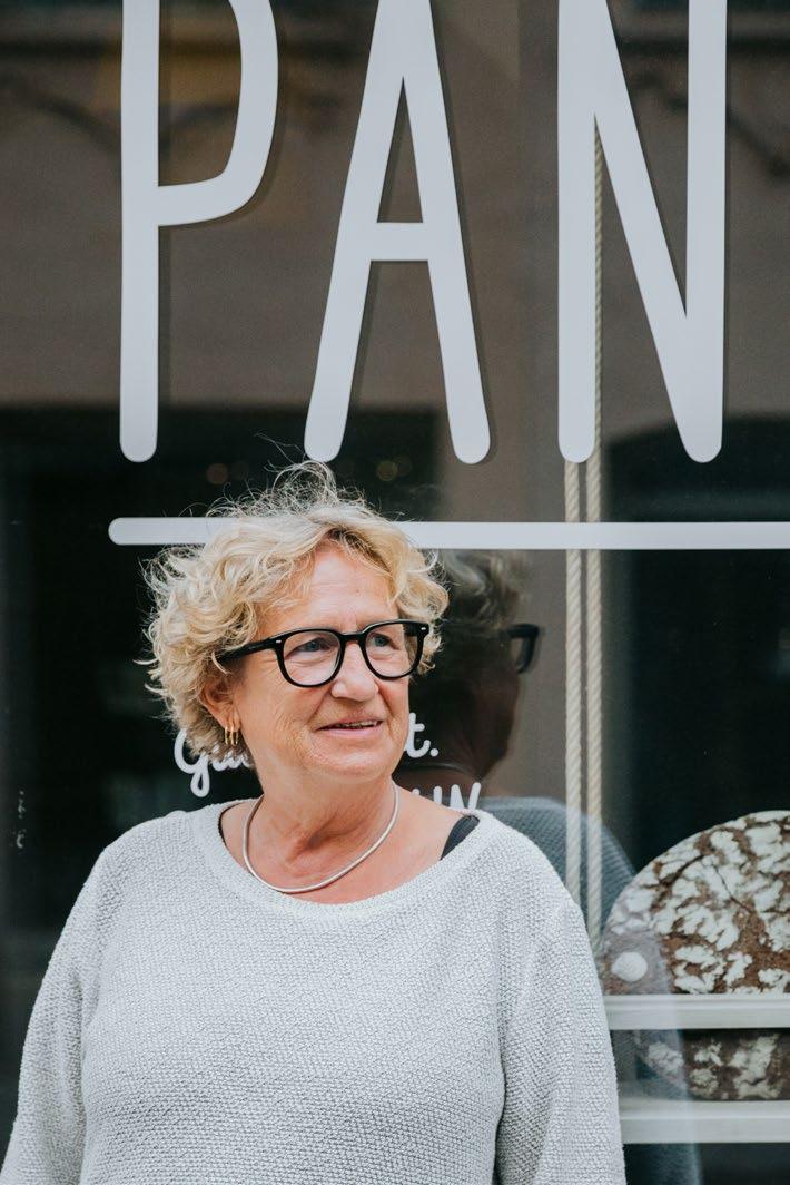 Seit gut einem Jahr ist Andrea Tarmastin jetzt schon in Pension. Trotzdem arbeitet sie immer noch in ihrem ursprüng lichen Beruf. „Ich bin einfach mit Herz und Seele Verkäuferin“, sagt sie. Bei Andrea stimmt das wirklich, quasi wortwörtlich. Vor allem seit sie ehrenamtlich im PANE aushilft. Dort kann sie tun, was sie liebt, und hilft dabei ihren Mitmenschen. PANE ist unser karitativer Shop in der Mariahilferstraße, in dem wir Brot vom Vortag für einen guten Zweck verkaufen. Dazu muss man vielleicht wissen, dass Andrea vor ihrer Pen sionierung acht Jahre lang bei MARTIN AUER gearbeitet hat. PANE kennt sie also schon lange. Dass sie sich dort gerne einmal engagieren würde, stand für sie ebenfalls früh fest. Sie sagt: „Ich helfe, wo ich kann. Geld kann ich zum Beispiel nicht so viel geben wie andere. Dafür habe ich jetzt in der Pension Zeit, die ich mir für soziales Engagement nehmen kann.“