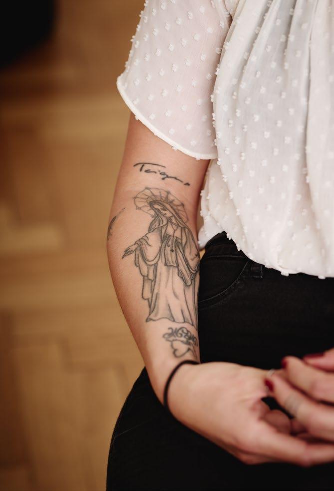 M I L A D E L A C R O I X Naja, viele Menschen sehen Tätowierun gen selbst nicht als so schlimm an, aber die Tätowierer. Die haben leider keinen besonders guten Ruf. Das kommt von früher, wo man Tattoos noch hauptsächlich mit Gefängnis sen verbunden hat. Mir ist das schon passiert, dass jemand erstaunt darüber war, dass ich eine Matura und ein Studium abgeschlossen habe.