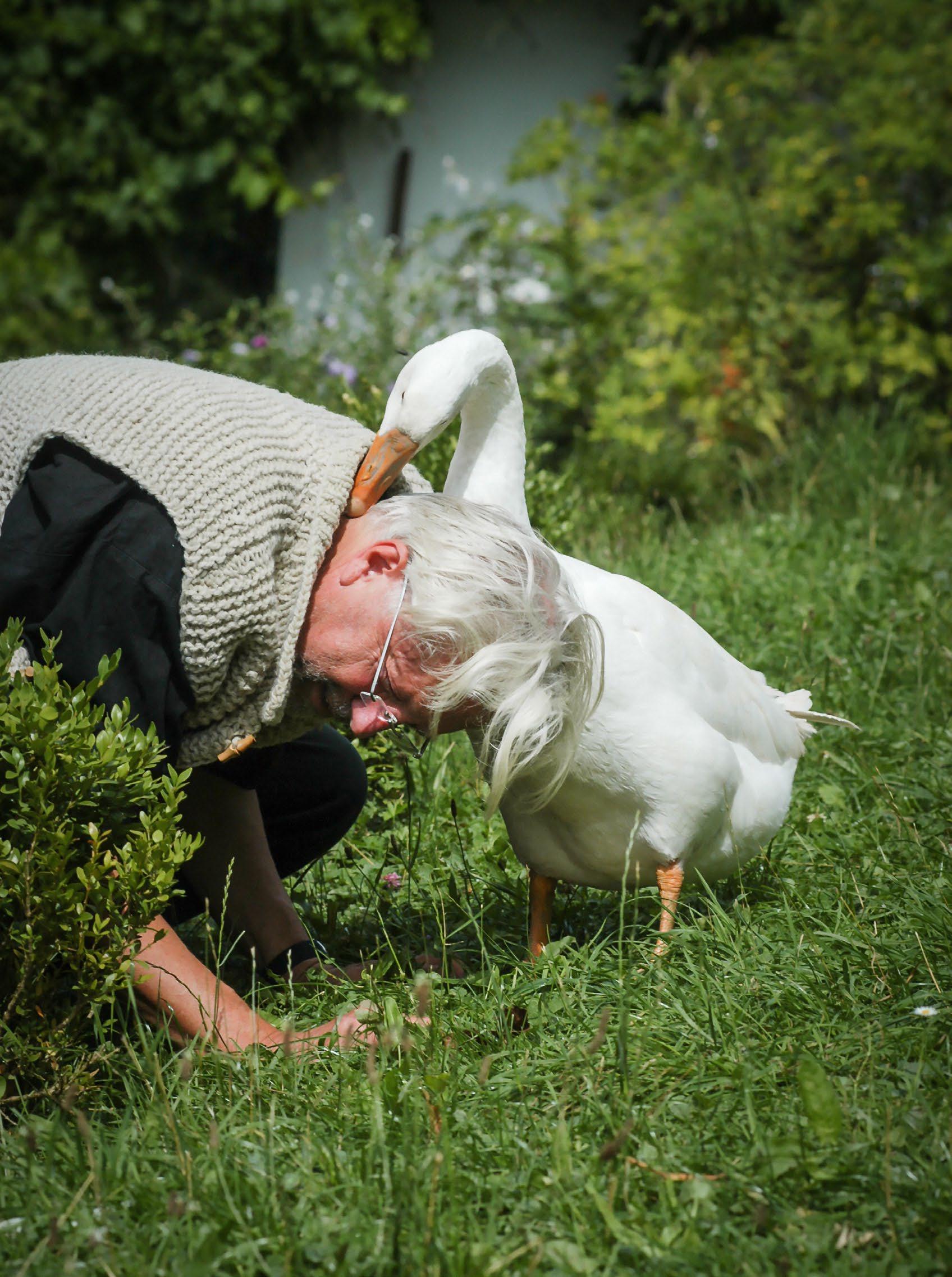Uns Menschen berührt die Art, wie mit Tieren umgegangen wird, ebenfalls in hohem Maße. Tierwohl kann unser eigenes Wohlbefinden steigern. Heinz Gerstner behauptet sogar: „Der Umgang mit Tieren heilt unsere Seele.“ Dazu muss man wissen, Heinz ist nicht nur ein Tierflüsterer, er ist auch Menschenversteher. Als Lebens- und Sozialberater sowie Erziehungshelfer hat er sich einst weitergebildet. Ein bunter Hund eben. Der Sonnhof, den er später aufgeben musste, weil er nach dem Tod seines Schwiegervaters in den Besitz seines Schwagers überging, bot so nicht nur allen möglichen Tieren ein Zuhause, sondern bald auch Jugendlichen, die in Schwierigkeiten geraten waren. Selbst die lautesten unter ihnen wurden ganz ruhig, wenn sie sich um die Tiere kümmerten. Viele sorgten zum ersten Mal für ein anderes Lebewesen, was ihnen dabei half, auch an anderen Beziehungen zu arbeiten. Wir binden hier übrigens niemandem einen Bären auf. Auch wissenschaftlich ist es erwiesen, dass Tiere einen Einfluss auf unsere Gesundheit haben können. Egal ob wir sie streicheln oder nur in ihrer Gegenwart sind: Zeit mit Tieren zu verbringen, senkt Blutdruck und Herzfrequenz. Wir entspannen uns nachweislich. Wie viel sie uns bedeuten, zeigt sich auch daran, dass wir ihnen alles vergeben. Heinz ist seiner dreifarbigen Katze, seinem absoluten Liebling, zum Beispiel gar nicht böse, dass sie damit begonnen hat, alles auf den Boden zu werfen, was im Haus herumsteht. Wenn Heinz aus dem Haus ist, tanzt die Katze auf dem Tisch. Für ihn ist sie trotzdem purr-fect.