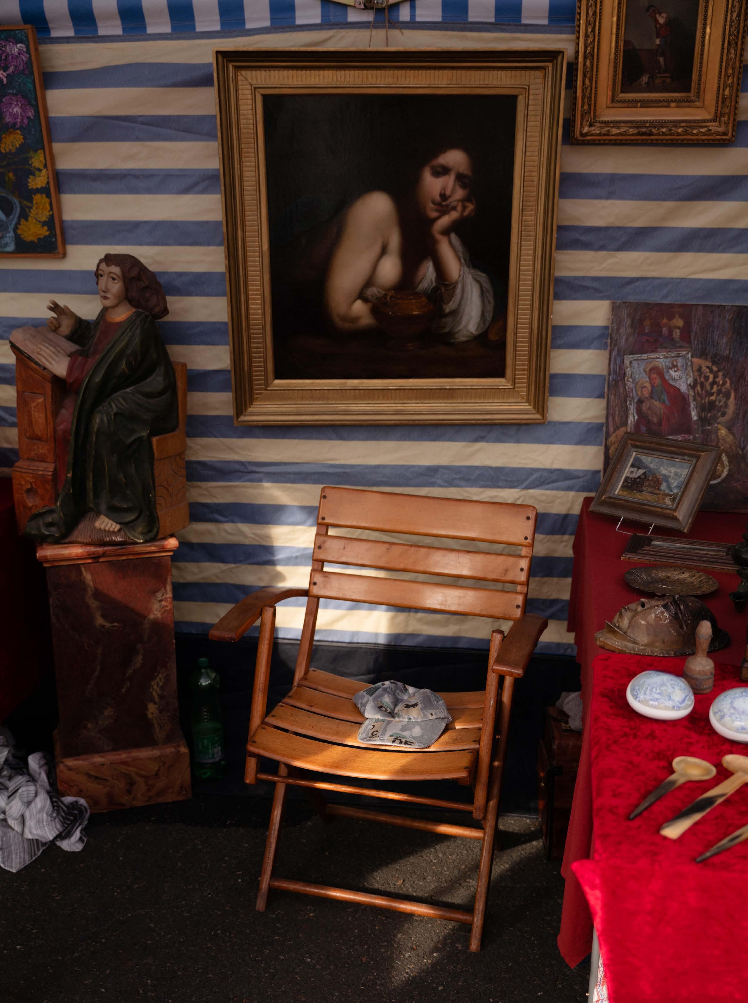 Standler:innen kennen sich untereinander. Man winkt sich zu, trifft sich auf einen Kaffee und lässt sich besonders spannende Stücke zeigen, um vielleicht gleich vor allen anderen zuschlagen zu können. Händler:innengeschick ist das eben. Viele sind das ganze Jahr über auf Märkten in ganz Österreich unterwegs, für manche ist es eher ein Hobby. Eine adrette Dame mit einer Jacke in Leopardenfellprint beschreibt es gut: „Es ist wie eine Sucht“, sagt sie. „Wenn man einmal begonnen hat, kommt man nicht so leicht davon los.“ Als sie in Pension ging, hatte sie mehr Zeit für ausgedehnte Flohmarktbesuche – und auch, um mehr „Kunst und Klumpert“ zu kaufen, wie sie ihre Leidenschaft in eigenen Worten beschreibt. Da der Platz zu Hause begrenzt war, begann sie schließlich auch selbst auszustellen. „Damit ich wieder mehr kaufen kann“, lacht sie.