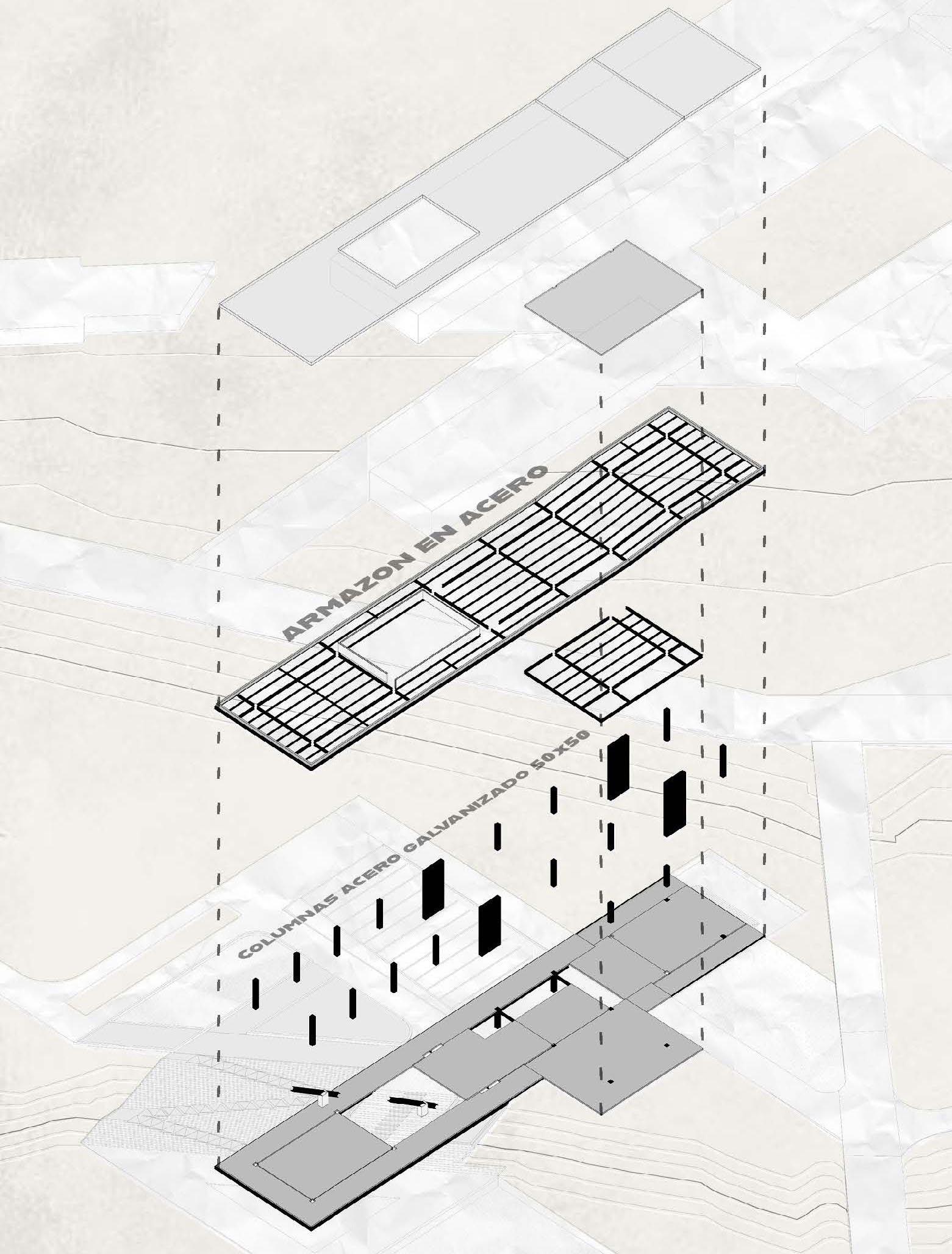 En este contexto, la conceptualización del pabellón toma como eje central las visuales y la relación con el entorno natural. La topografía del cerro, caracterizada por pendientes pronunciadas y variaciones en la elevación, plantea desafíos y oportunidades para la implantación del proyecto, lo que exige una adaptación cuidadosa a las condiciones del terreno. Además, la presencia de una vegetación densa y diversa no solo influye en la integración del pabellón con el paisaje, sino que también enmarca