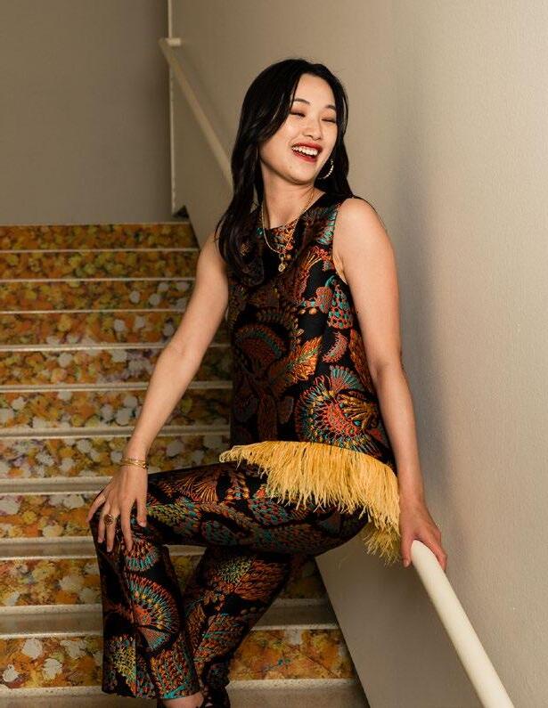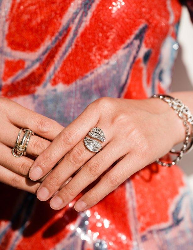 HONG MAN FOUND A PIECE THAT IS DIFFERENT FROM EVERY ANGLE. HER EYE-CATCHING DRESS IS ROSETTA GETTY’S SHORT SLEEVE SEQUIN GOWN. HER FABULOUS BOOK-INSPIRED PURSE IS FROM OLYMPIA LE-TAN, AND SHE WEARS THE SPINELLI KILCOLLIN MIXED METAL RING WITH PAVE DIAMONDS, ANIT KO WHITE GOLD DIAMOND PALM LEAF RING, HOORSENBUHS WHITE GOLD AND PAVE DIAMOND BRACELETS, AND HOORSENBUHS DIAMOND HOOPS.