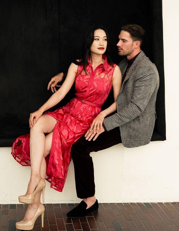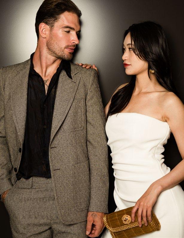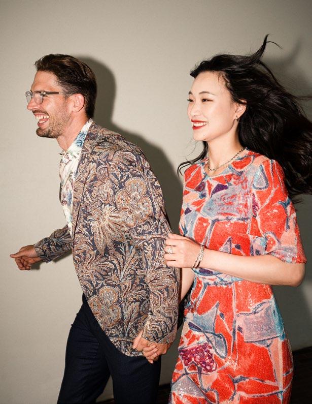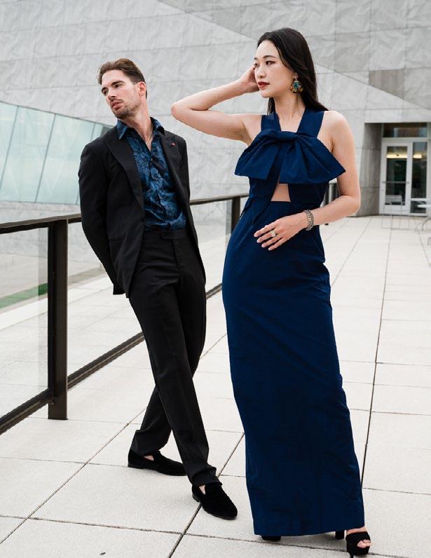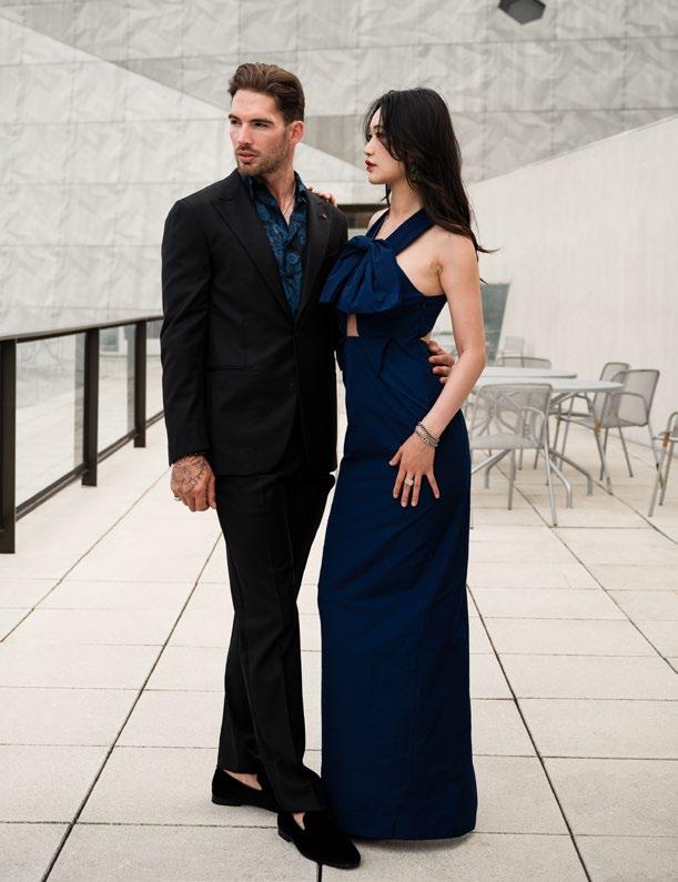 MIDNIGHT BLUE IS THE PERFECT COLOR FOR THE PARTY THAT GOES ‘TIL THE STROKE OF 12. JERED AND HONG MAN MAKE IT HIS-ANDHERS-WORTHY WITH THE ETRO ROMA SHIRT IN BLUE PAISLEY AND FLEET WEEK GOWN IN NAVY BY ROSIE ASSOULINE. JERED’S CLASSIC ISAIA TUXEDO WITH PEAK LAPEL PAIRS PERFECTLY WITH THE BIT OF WHIMSY HIS PAISLEY OFFERS WHILE THE GOWN OFFERS VISUAL INTRIGUE WITH ITS PEEK-A-BOO CUTOUTS. HONG MAN FINISHES THE LOOK WITH SYLVA & CIE MIXED METAL DOUBLE WRAP LINK BRACELET WITH DIAMONDS, SYLVA & CIE FANCY DIAMOND RING, AND SILVIA FURMANOVICH MARQUETRY EARRINGS SET IN GOLD WITH WHITE DIAMONDS.
