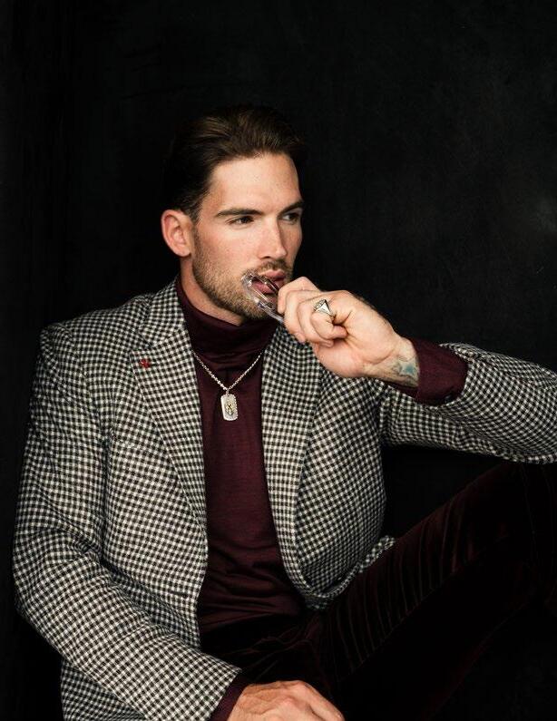 ROCK STAR IS AN ATTITUDE NOT JUST LIMITED TO CELEBRITY. JERED CHANNELS THE ‘70S WITH THE DRIES VAN NOTEN BLAZEY BLAZER AND PARCHIO PANTS BOTH IN SAND. THE CONTEMPORARY TWEED AND WIDER LAPEL PROCLAIMS “FASHION-FORWARD,” WITH JUST A TOUCH OF EDGE. HE FINISHES THE LOOK WITH THE DRIES VAN NOTEN CARBINO SHIRT IN NAVY, MILAMORE WHITE & YELLOW GOLD BRACELET, AND SHAMBALLA JEWELS BROWN SAPPHIRE BRACELET.