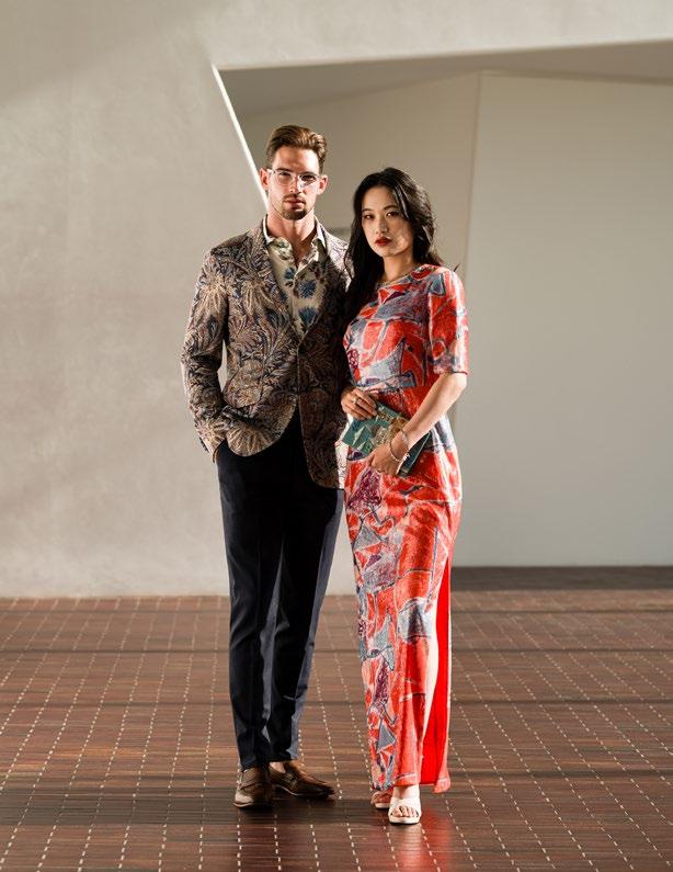 JERED KNOWS THAT SOPHISTICATION DOESN’T MEAN UPTIGHT. PLAYING WITH TEXTURE, THE SOFT FABRICS OF HIS RALPH LAUREN PURPLE LABEL HAYWORTH SUEDE SKEET JACKET AND THE PESCAROLO FLAT FRONT CORDS IN PINE GREEN ARE ELEVATED WITH THE PATTERNED ETRO’S CAMICIA ROMA SHIRT IN FLORAL FOR A SWOON-WORTHY, ALL-NIGHT LOOK.