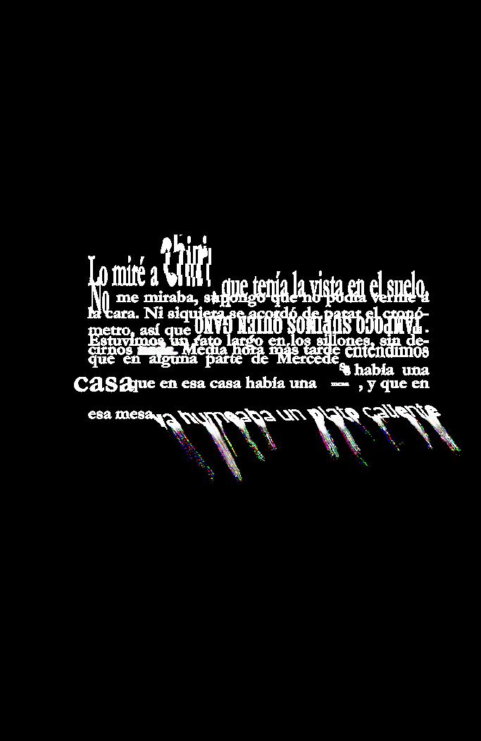 —No. No, no... Es la primera vez que vengo, te lo juro. Pero no quería aparecer así, de golpe. Por eso te llamé. —¡Hijo! —gritó ella, desgarrada— ¡Colgá y apurate, vení, vení! Casi 17 minutos, hacía falta algo más. Cuando supe lo que iba a decir, mi puño izquierdo se cerró. Ahora creo que la maldad ya me había invadido. Creo que no era yo el que hablaba. Eso que no sabemos qué es, eso que nos hace humanos y horribles, ahora estaba enquistado en mí y yo era su marioneta.