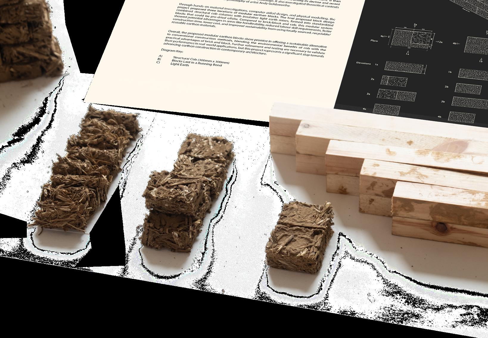 This design research project aimed to develop a modular earthen wall system that merges the advantages of traditional cob construction with those of typical brick and block construction to deliver superior overall performance. The project explores the current dominance of brick and block construction in the UK, highlighting its historical development and limitations. It then delves into the history and characteristics of cob construction, discussing its decline and recent resurgence, particularly through projects like CobBauge. It also investigated theoretical contexts like the ephemeral material philosophy of artist Andy Goldsworthy.