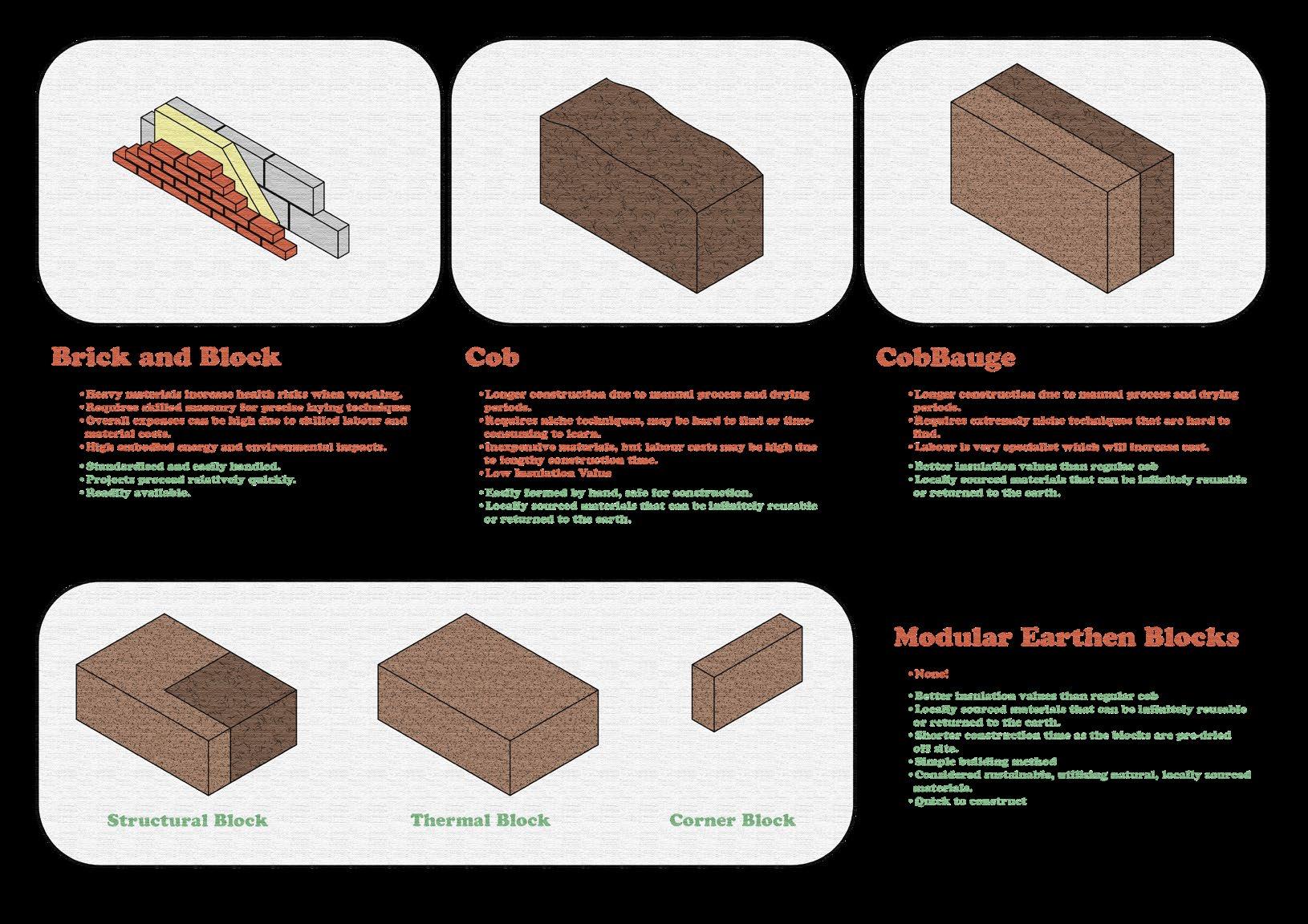 The proposed blocks utilise the same natural material palette that traditional cob does. These materials are abundant can be locally sourced and can be disposed of with no negative environmental impact.